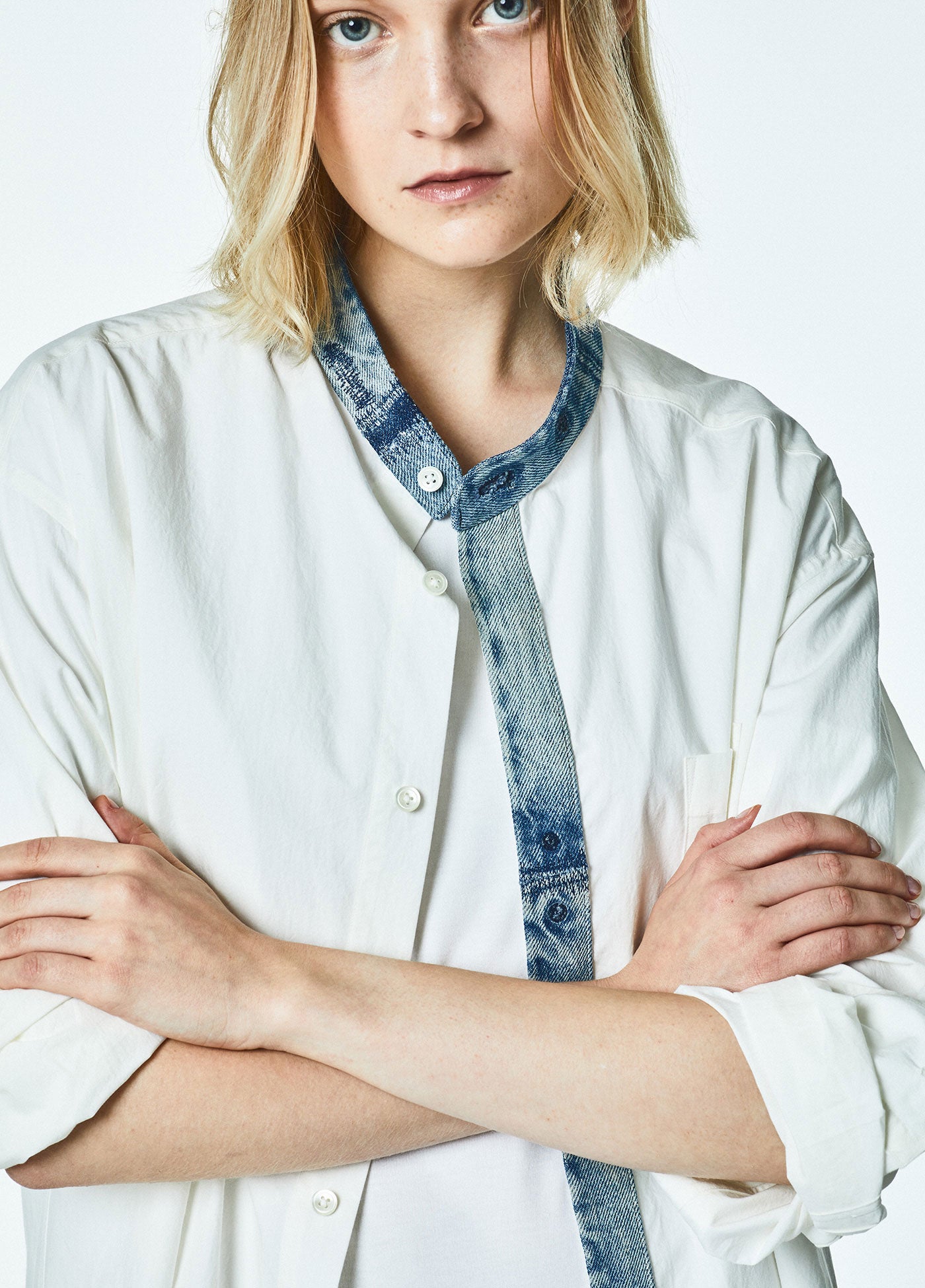 古着のデニムを丹念に洗浄し、丁寧にリペアを施して再生したデニム×コットンシャツです。スタンドカラーと前立て部分にデニムを使用しています。