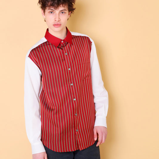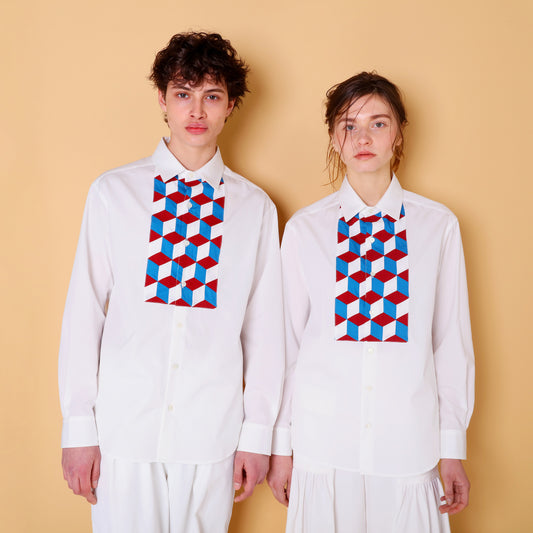 トロポポーズ再始動の第1弾は、トロポポーズらしいパッチワークシャツ「TUMBLING DICE」。上質な白シャツに幾何学模様のパッチワークをあしらった、シンプルだけどひと癖あるデザインシャツです。