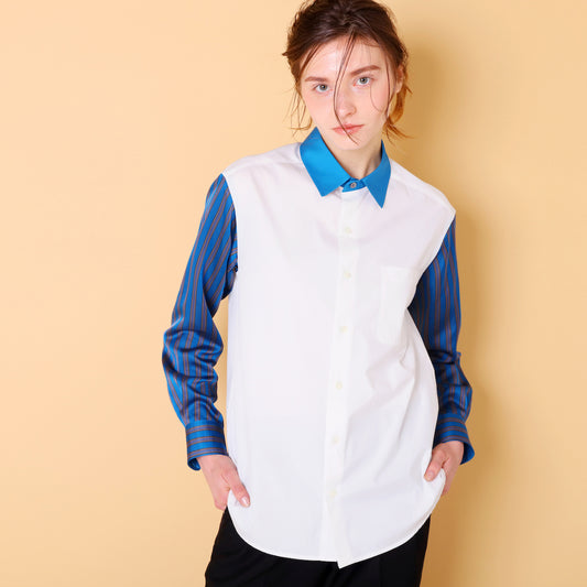 トロポポーズ2021年4月の「青の組成」シリーズから、アシンメトリーな切り替えシャツ「Sunny Blue(サニーブルー)」と「Baby Blue(ベイビーブルー)」の2着を紹介します。