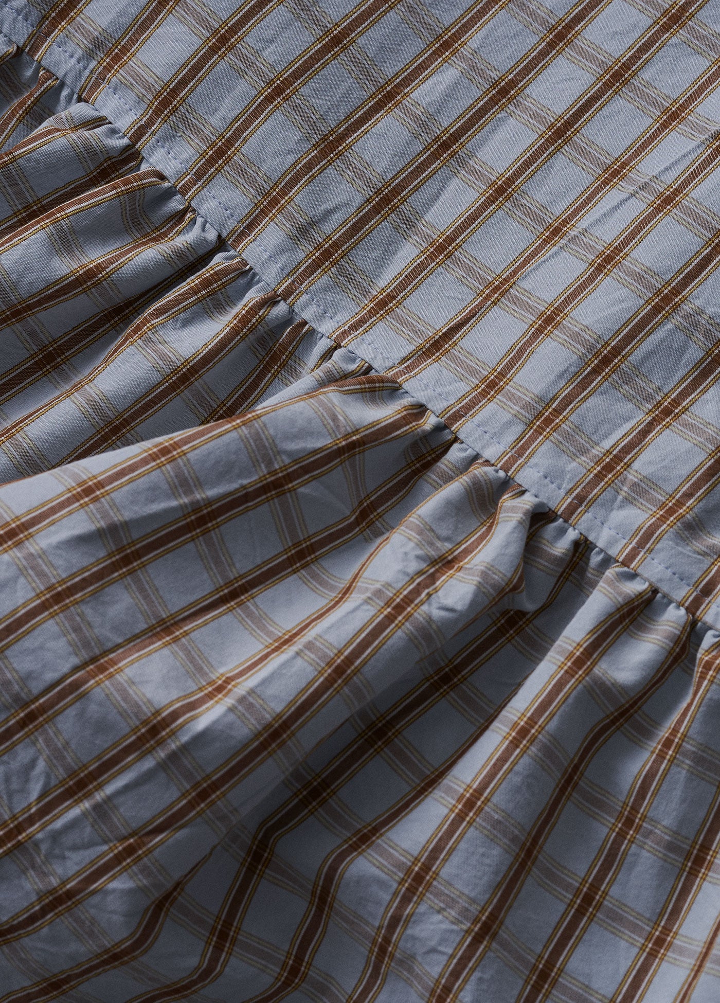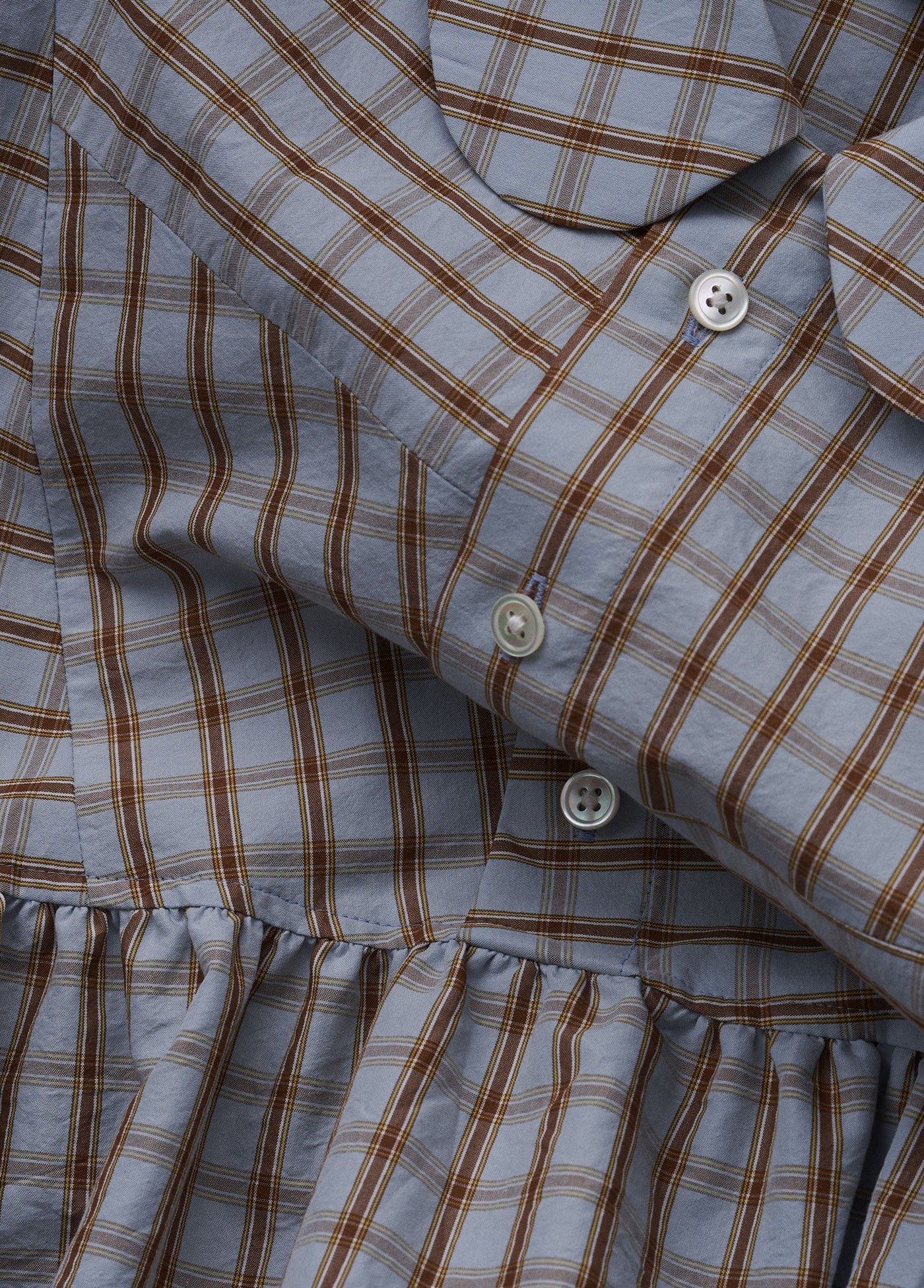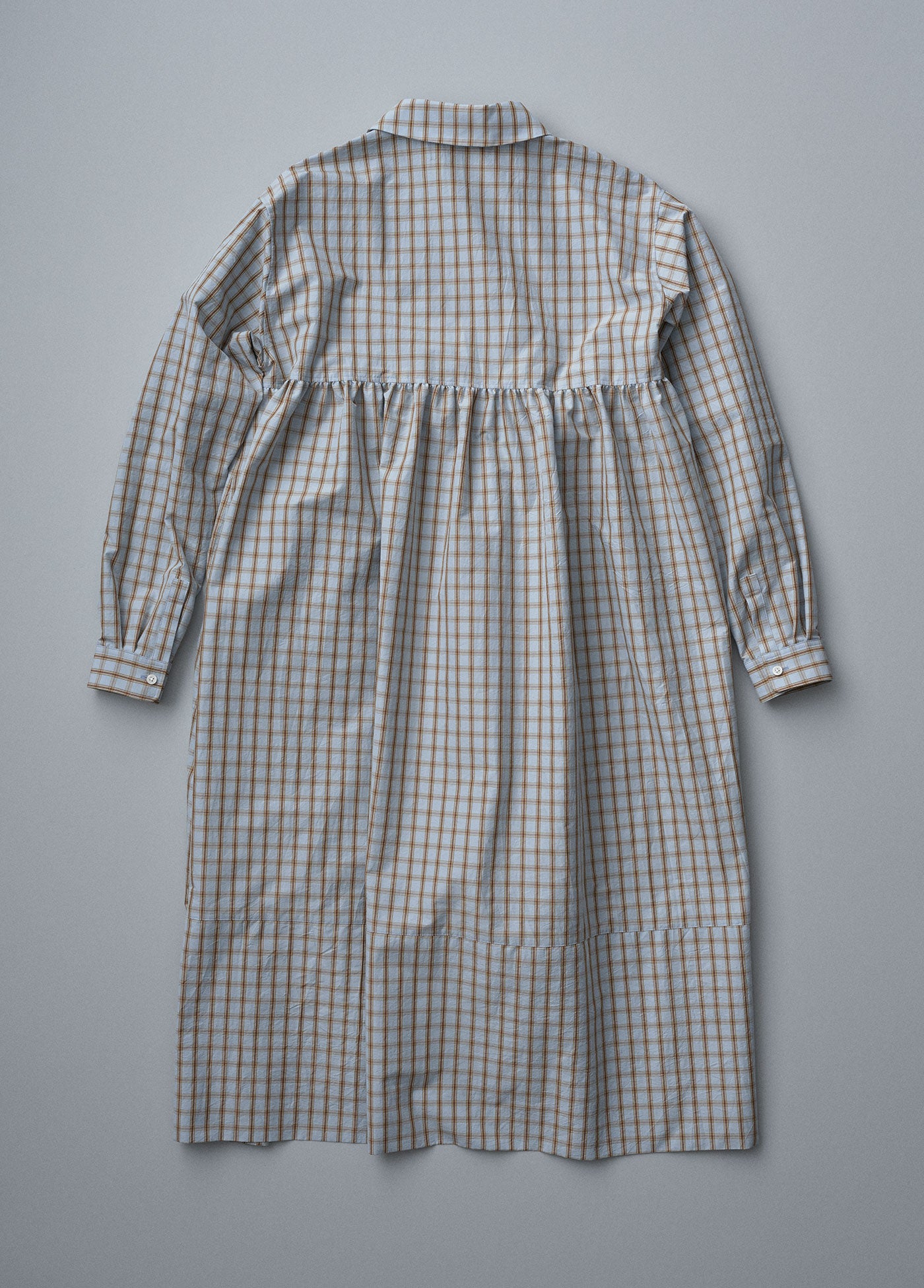 5月のMONTHLYコレクションでは、初夏にふさわしい軽やかなパッチワークのワンピースをご用意しています。ふんわりとしたシルエットとパッチワークがポイントになったチェックのワンピース。サイドのスリットや大きめの丸襟、たっぷりとしたボリュームなど、どこか80年代テイストの懐かしさを感じるシルエットです。