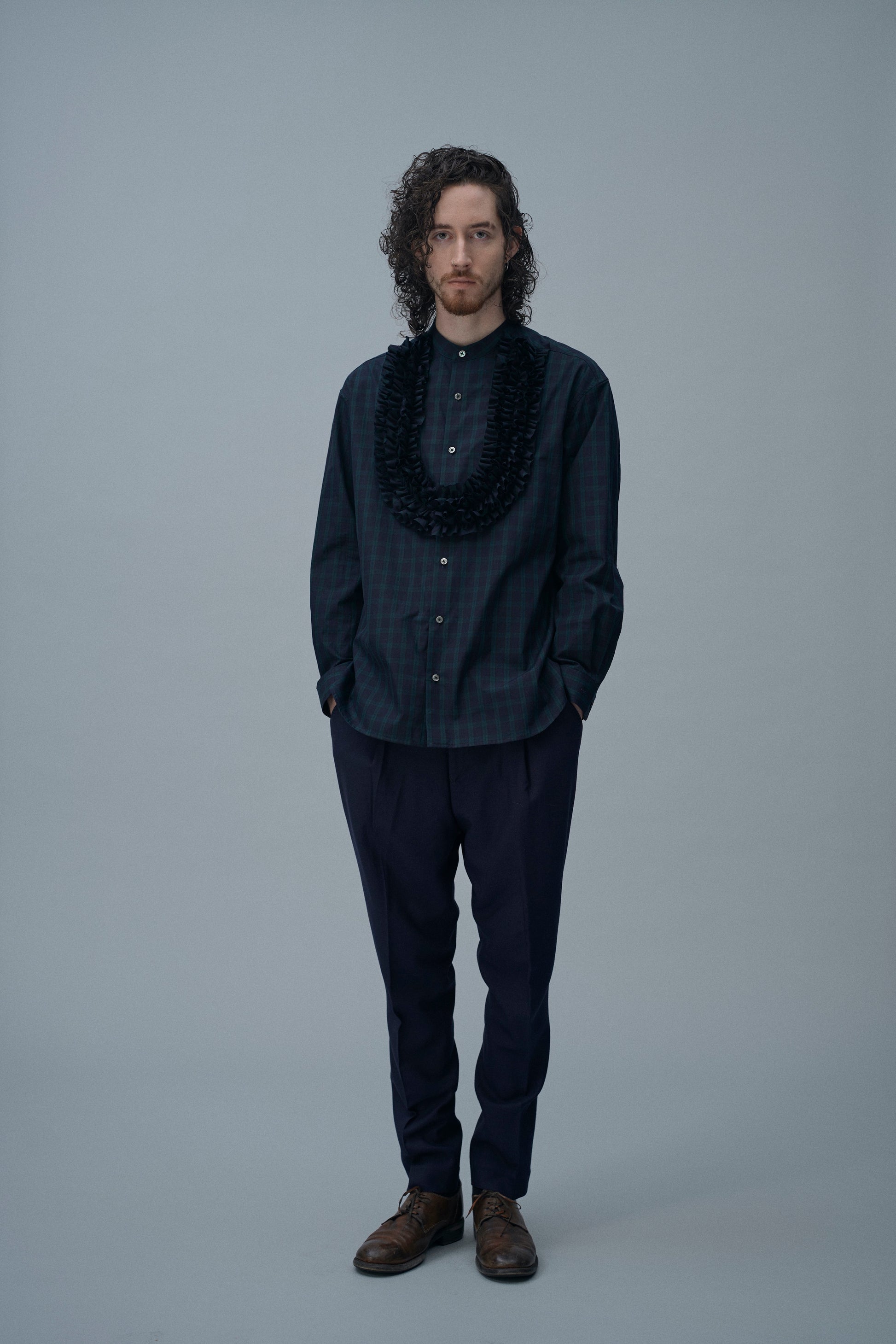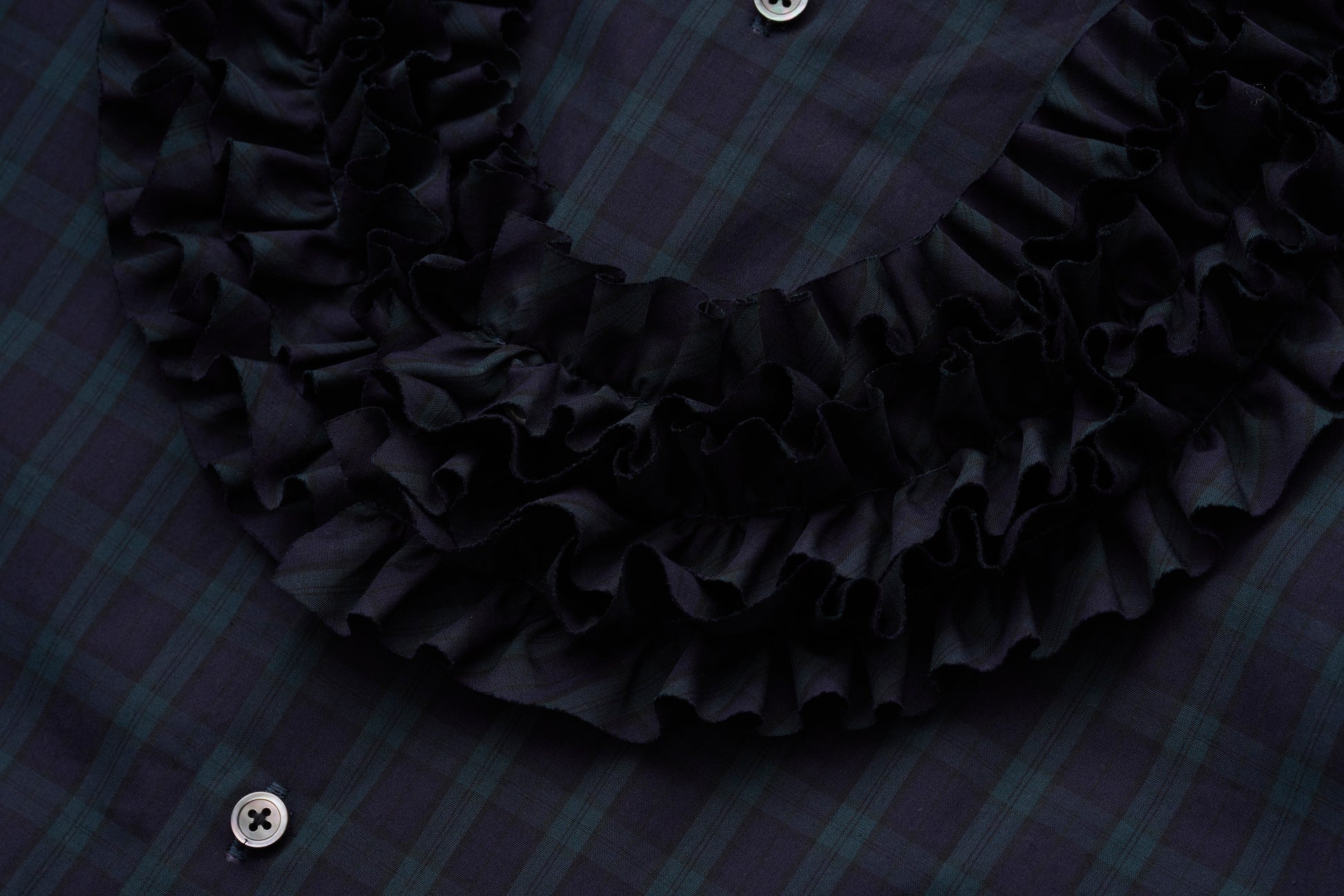 胸元にフリルのついた上品でインパクトのあるシャツ。