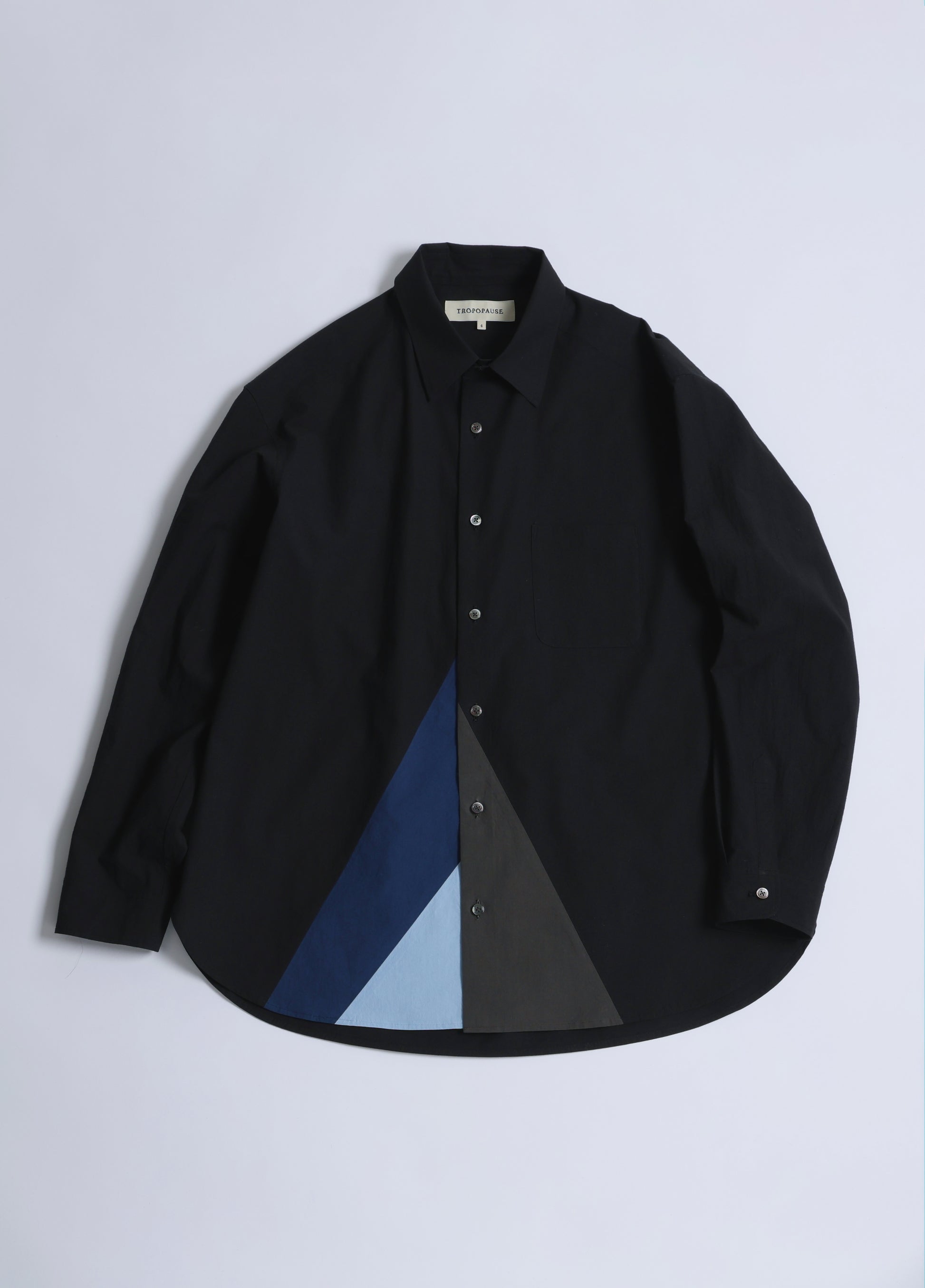前身頃にアシンメトリーな3色のパッチワークを施しています。