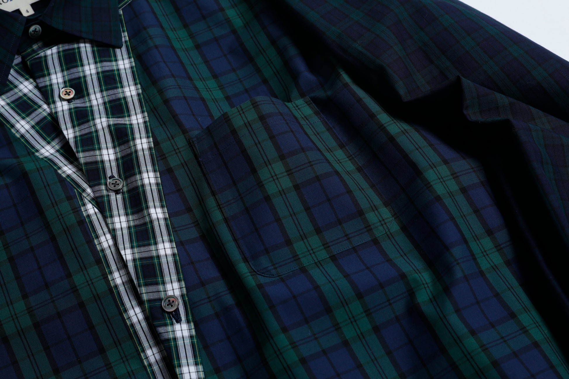 タータンチェックの生地は、シャツ地の産地として名高い兵庫県西脇市にて、100-120番の細い糸で丁寧に織られました。最高峰のヨーロッパ生地にも引けを取らない、しなやかで美しく光沢のある生地です。