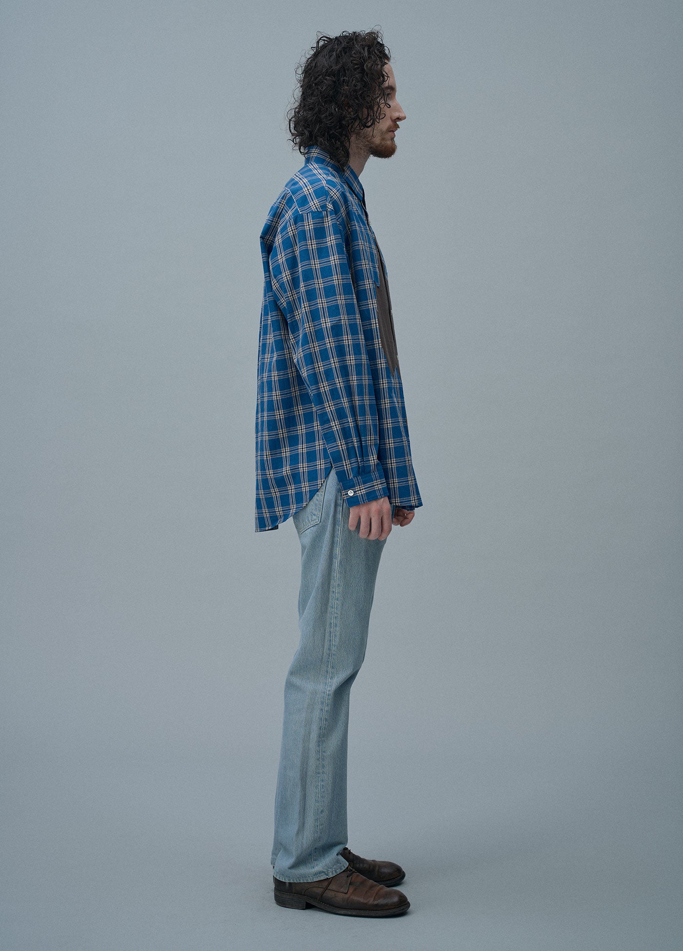 カジュアルに着られるブルーのチェックシャツと、近江晒を施した質感のいいネイビーのコットンシャツ。生地と色合いの異なる2色をご用意しています。