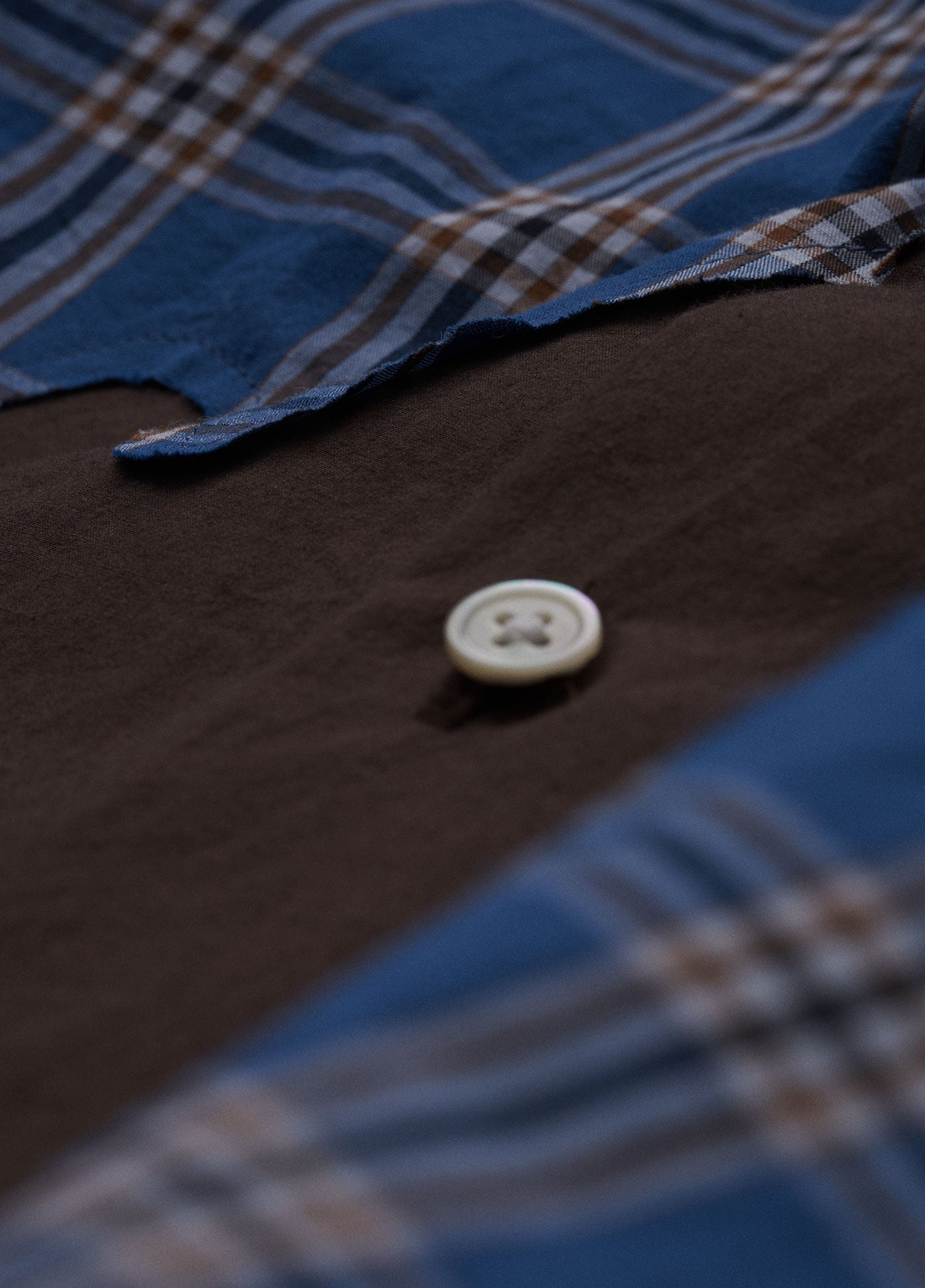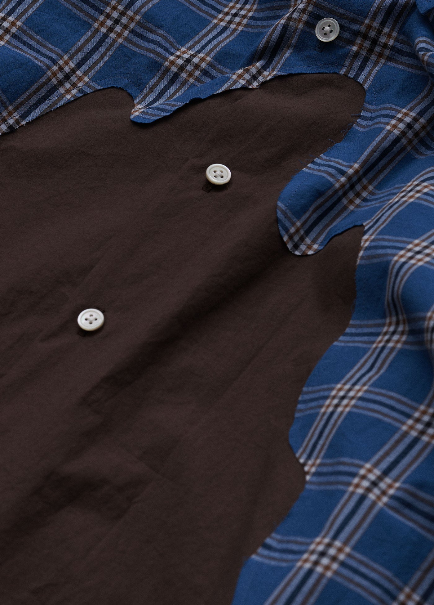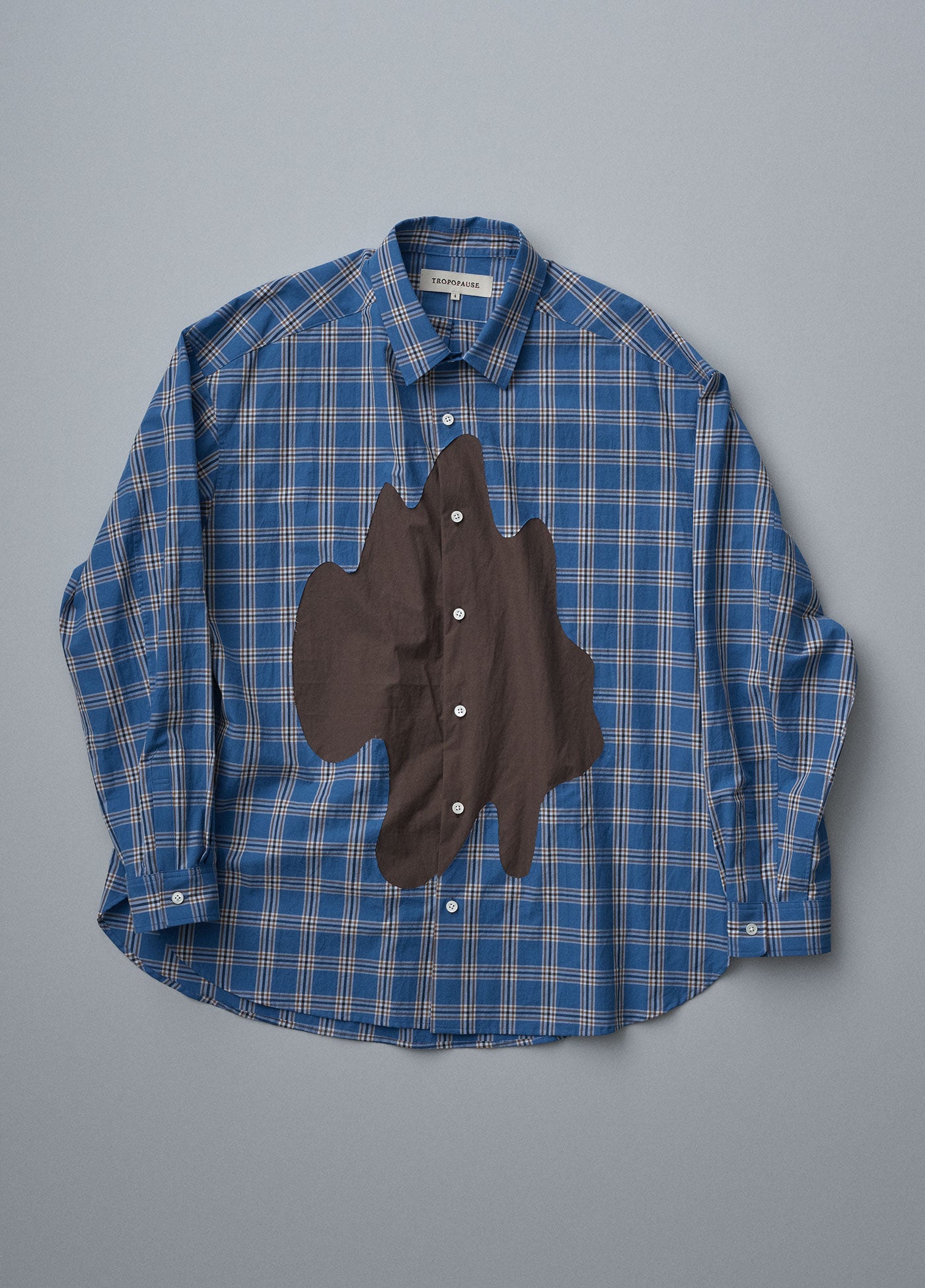 11月のMONTHLYシャツは、インクが飛び散ったような“しみ”のパッチワーク。大胆に繰り抜いたシャツに下から別の生地を充てて、大きな穴のような模様を生み出しました。