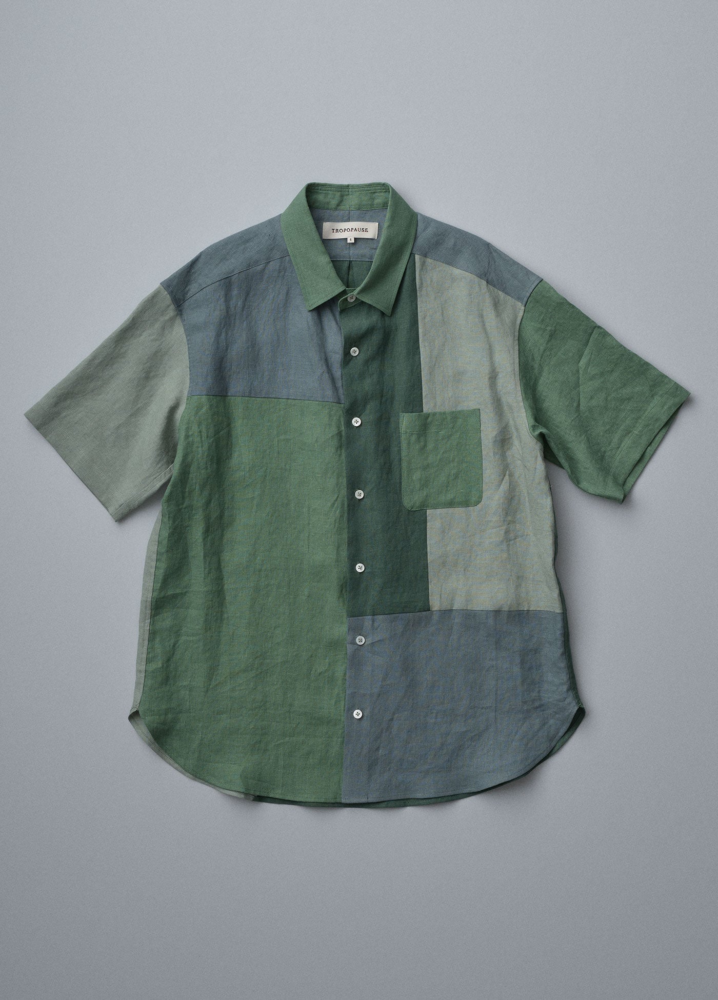 7月のMONTHLYテーマはSHADE。陰影を表すような同系色のリネン生地で構成した、繊細な色合いの違いを楽しむパッチワークシャツです。