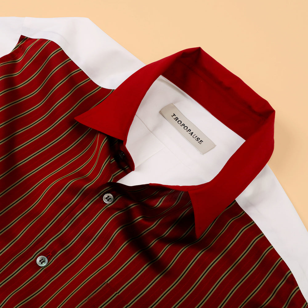 上質な白シャツにバーガンディカラーを合わせた、ユニセックス展開のデザインシャツです。