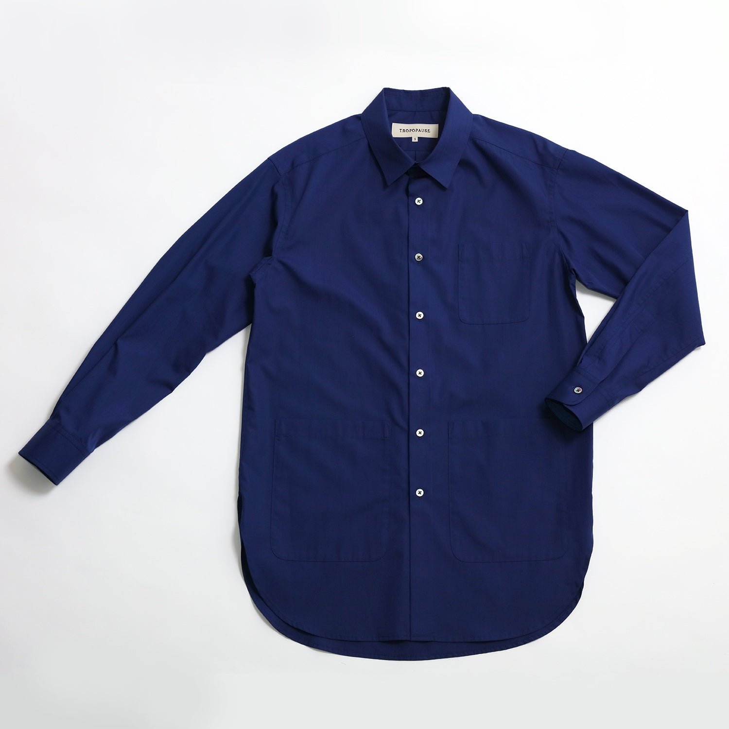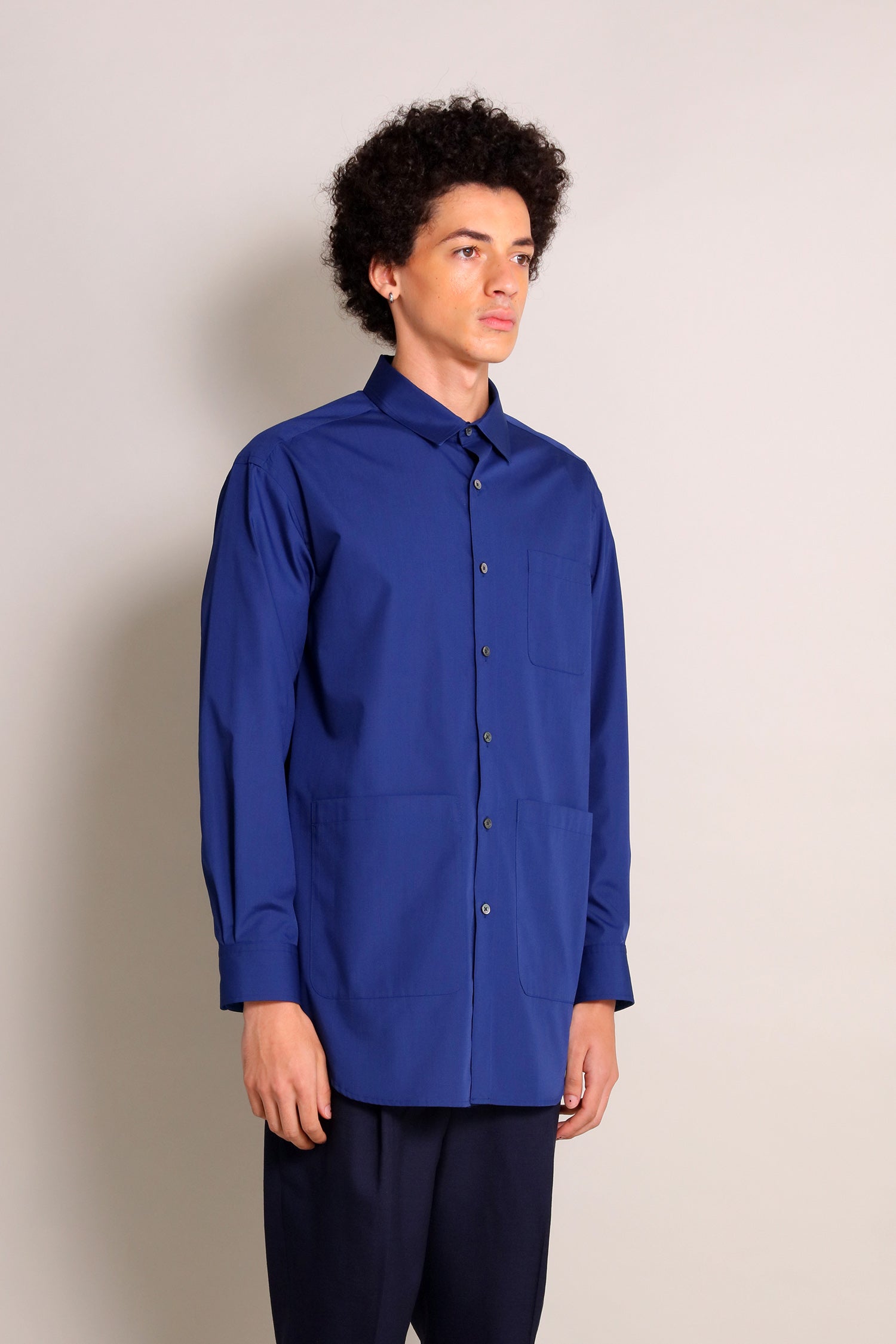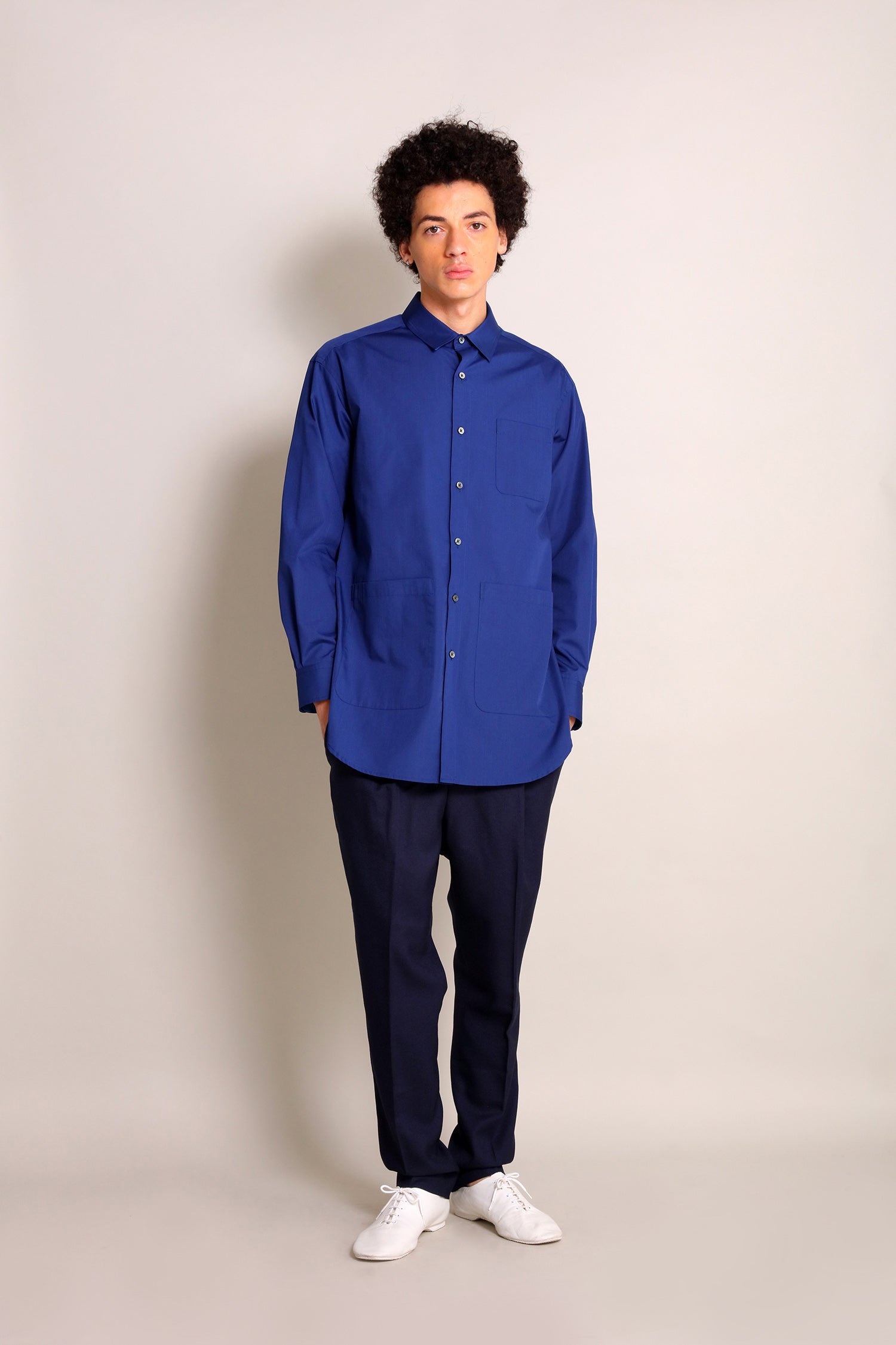 1枚でもアウターとしても着られる、ロイヤルブルーのロングシャツです。