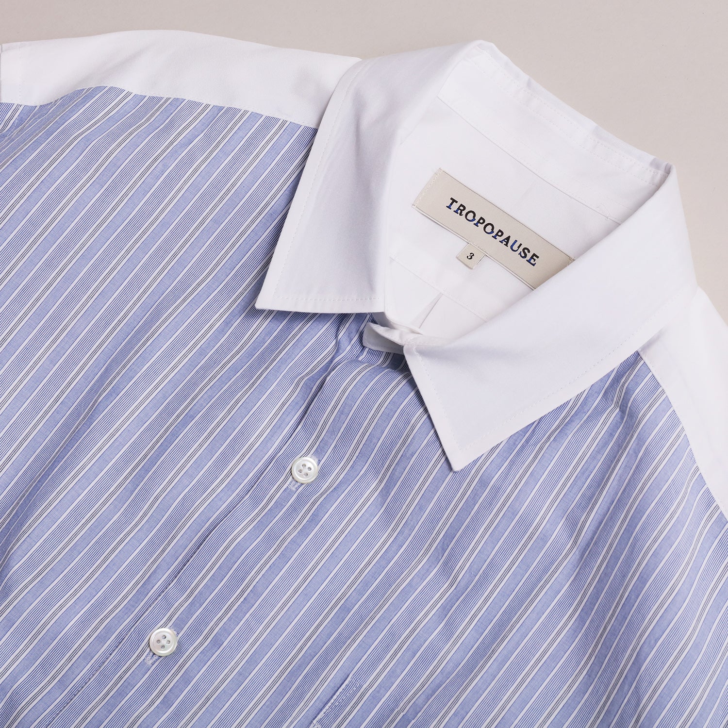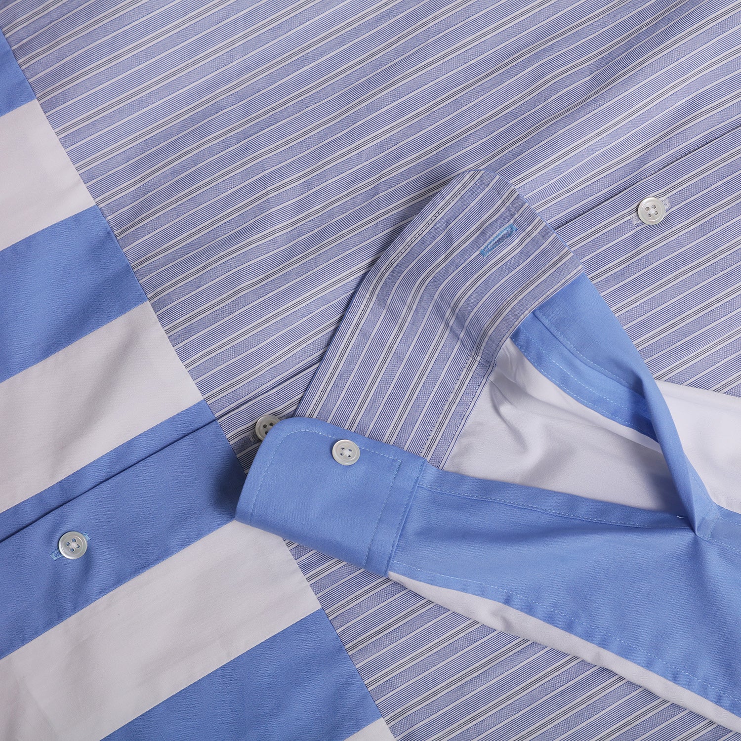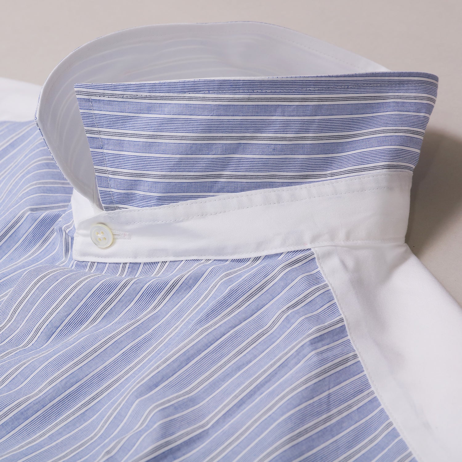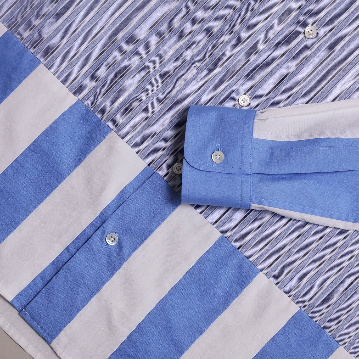 爽やかなブルーのストライプを組み合わせたユニセックスのパッチワークシャツ。360度、どこから見ても違う表情を見せてくれるデザインシャツです。