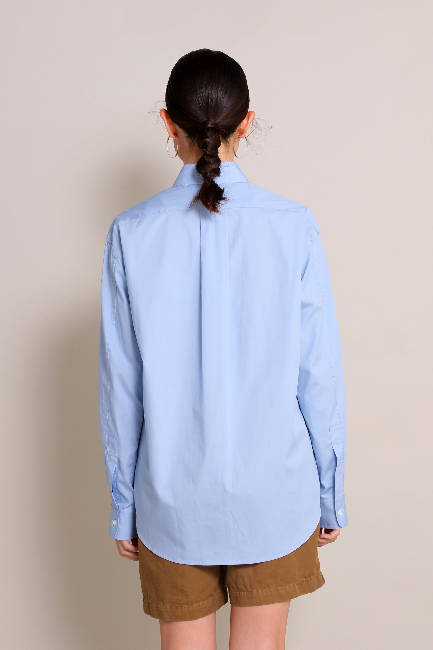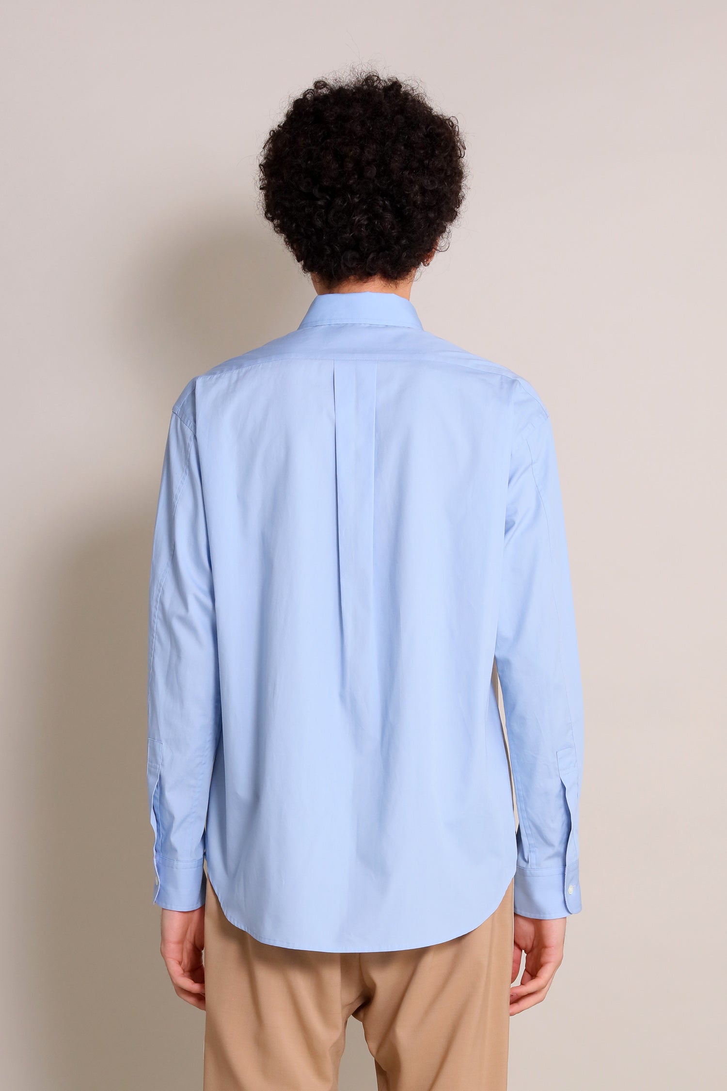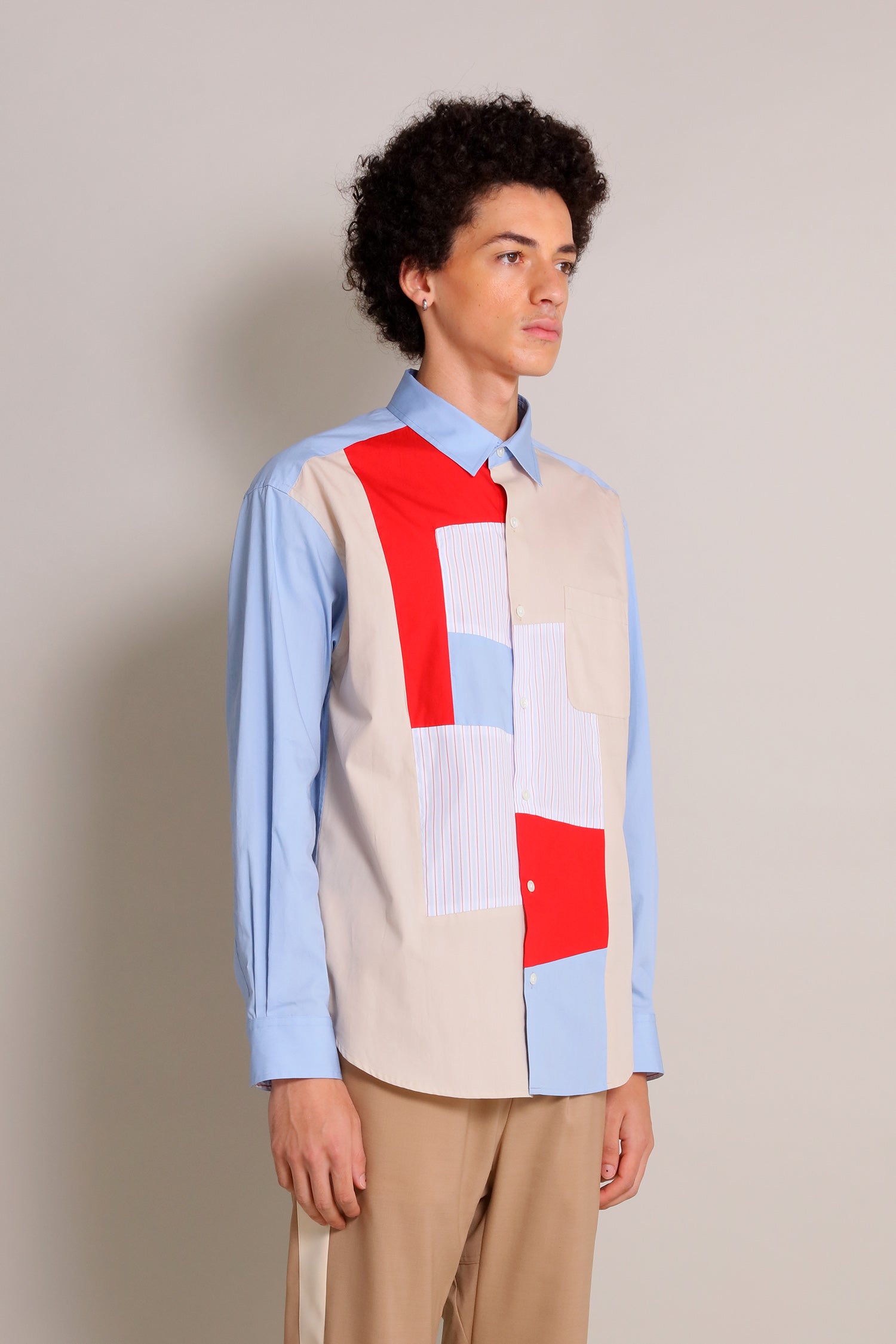 爽やかなブルーのシャツにパッチワークを施した、ポップなデザインの長袖シャツ。ユニセックス展開で、体型や性別を問わずご着用いただけます。