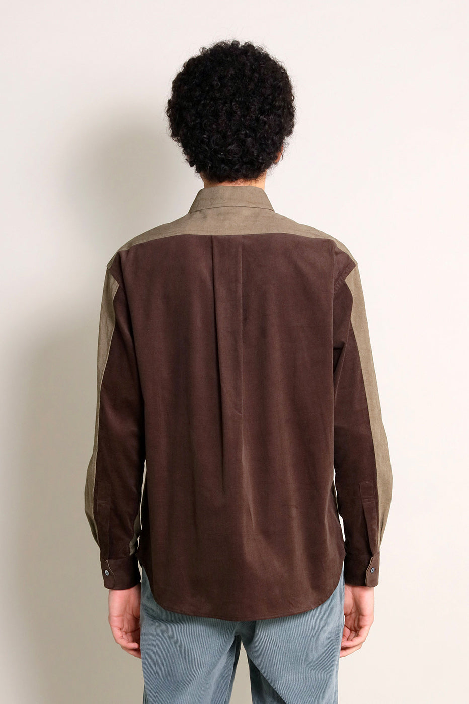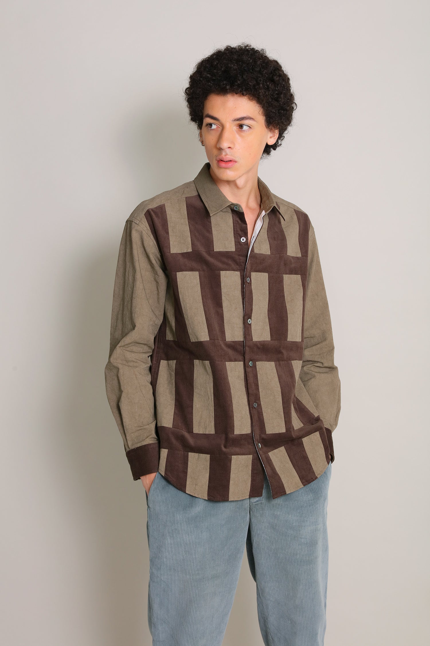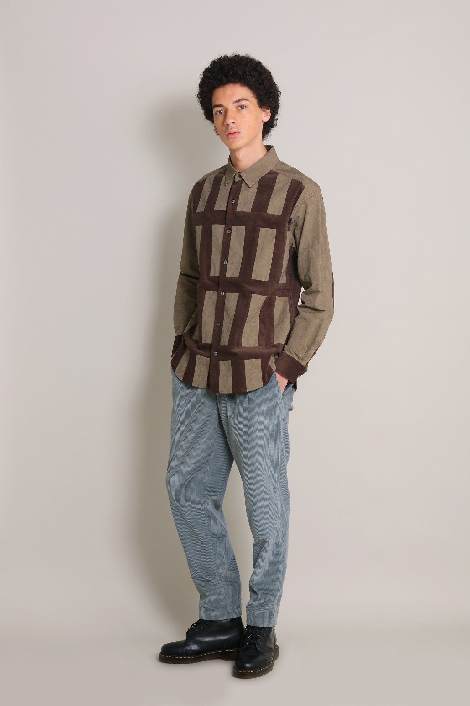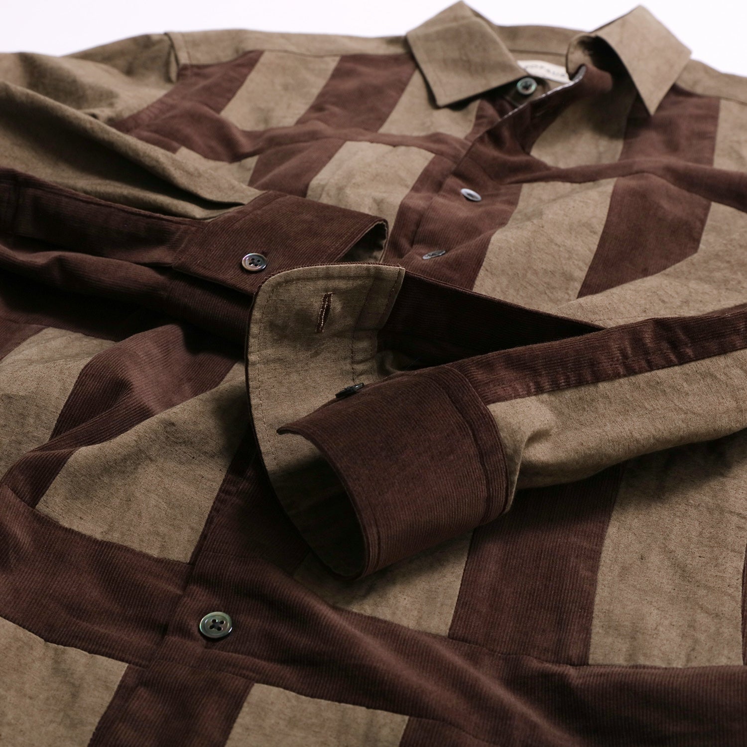 手描きの線があたたかみを感じる、異素材を組み合わせたパッチワークシャツです。