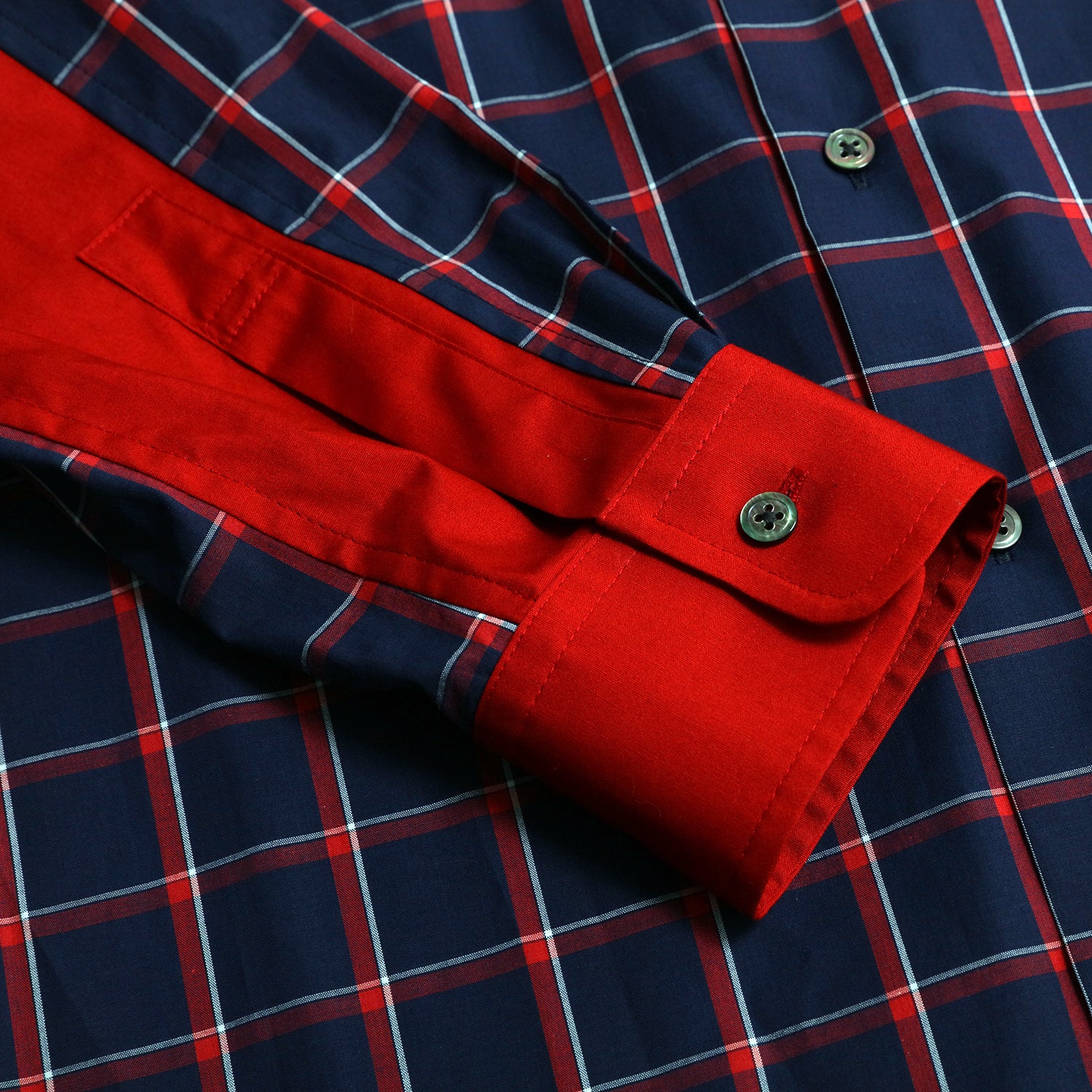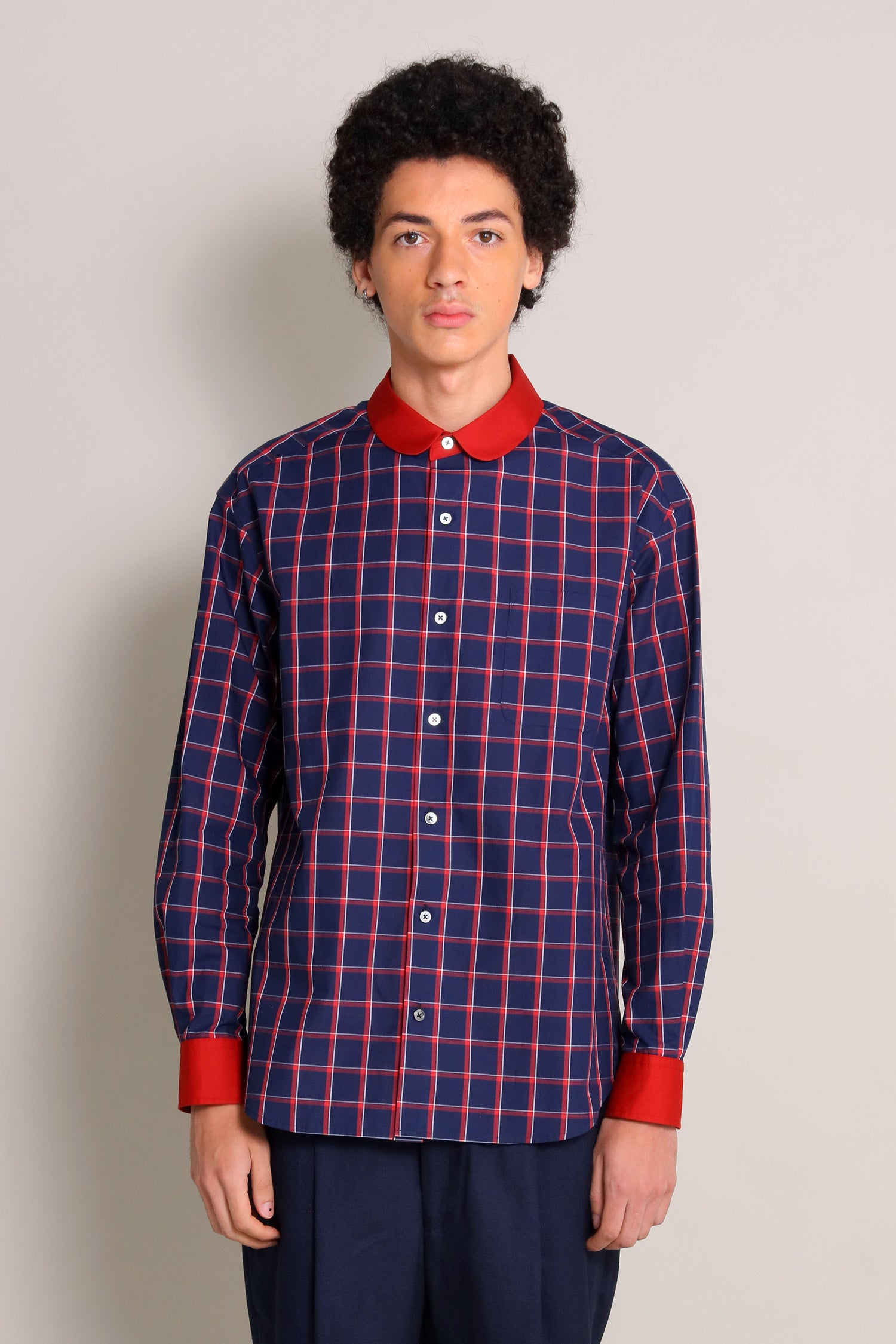 ネイビーを基調にした落ち着いた雰囲気の丸えりチェックシャツ。えりと内袖部分がさりげなく切り替えになったスタイリッシュなデザインです。