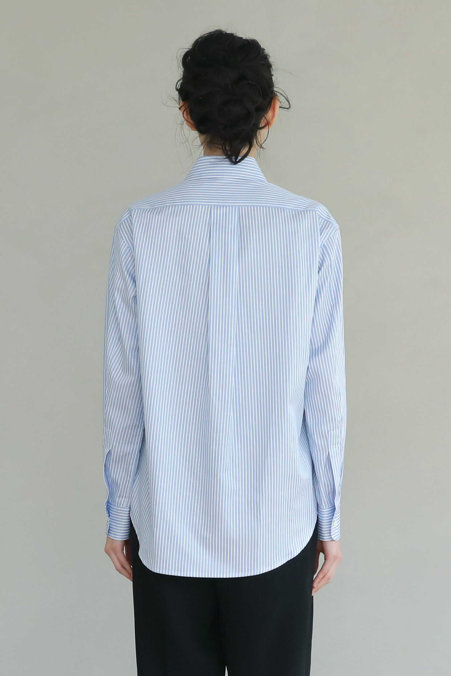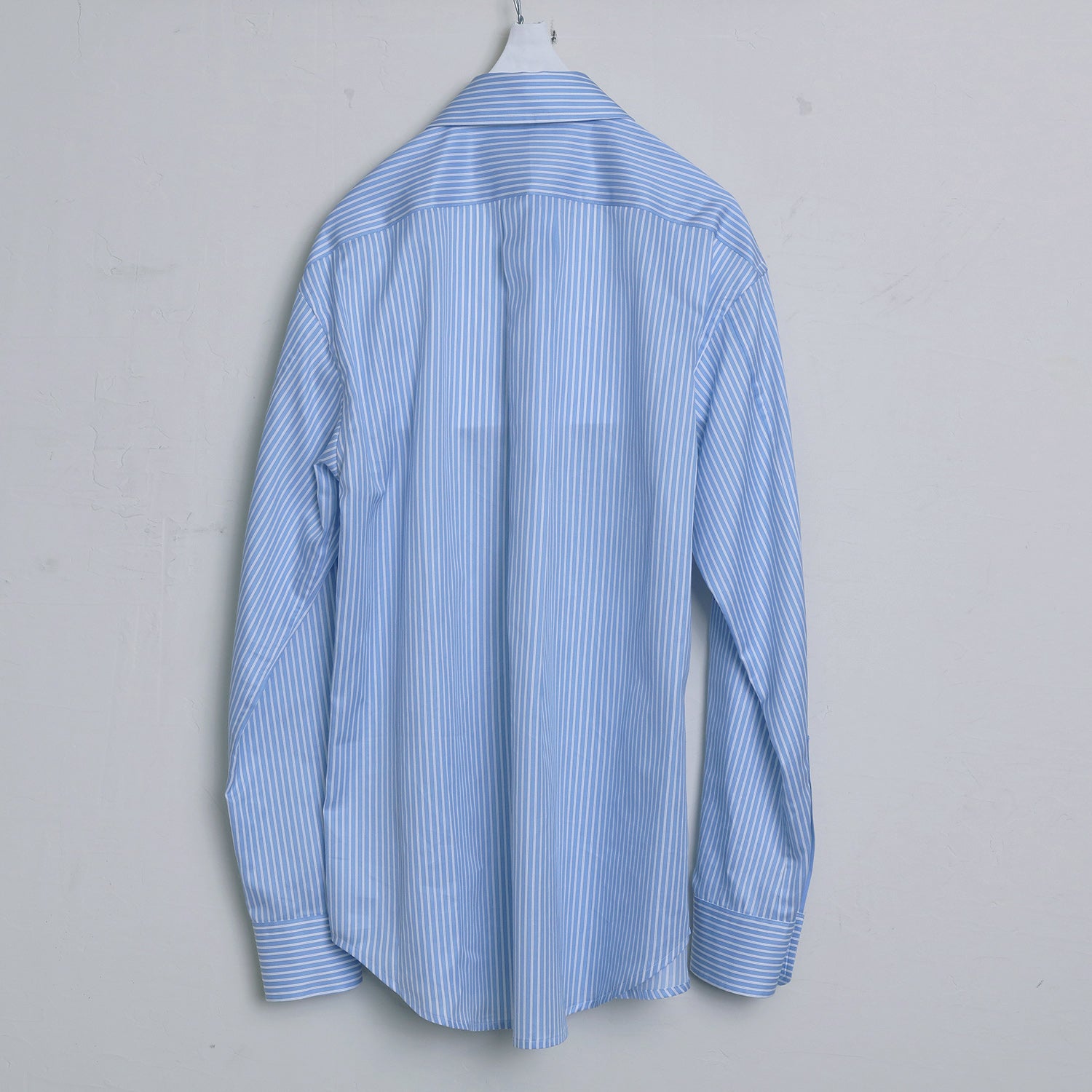 ビジネスにもカジュアルにも着回せるサックスカラーのパッチワークシャツ。動きやすい2枚袖仕様です。