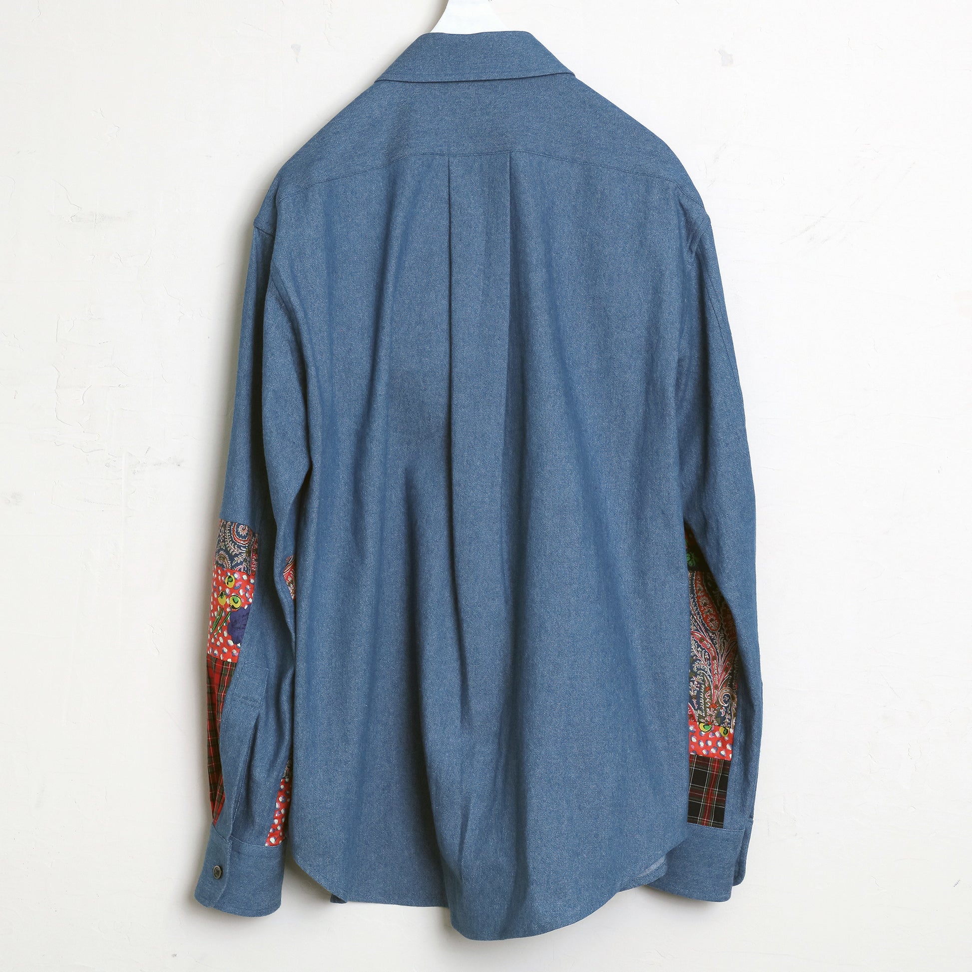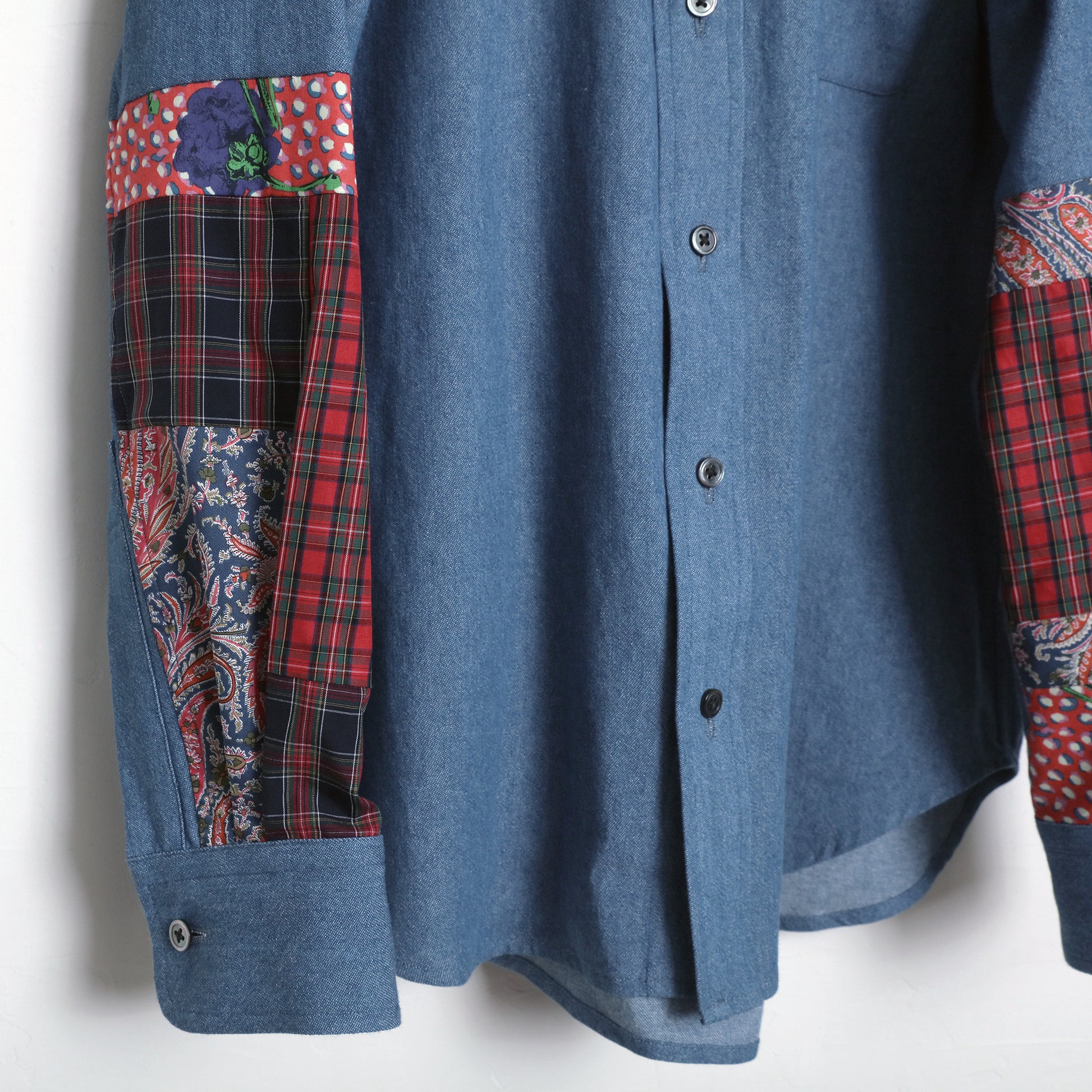 両袖にパッチワークを施した、5.5オンスのデニムシャツです。パッチワーク部分にはリバティプリントなどのデッドストック生地を使用しています。