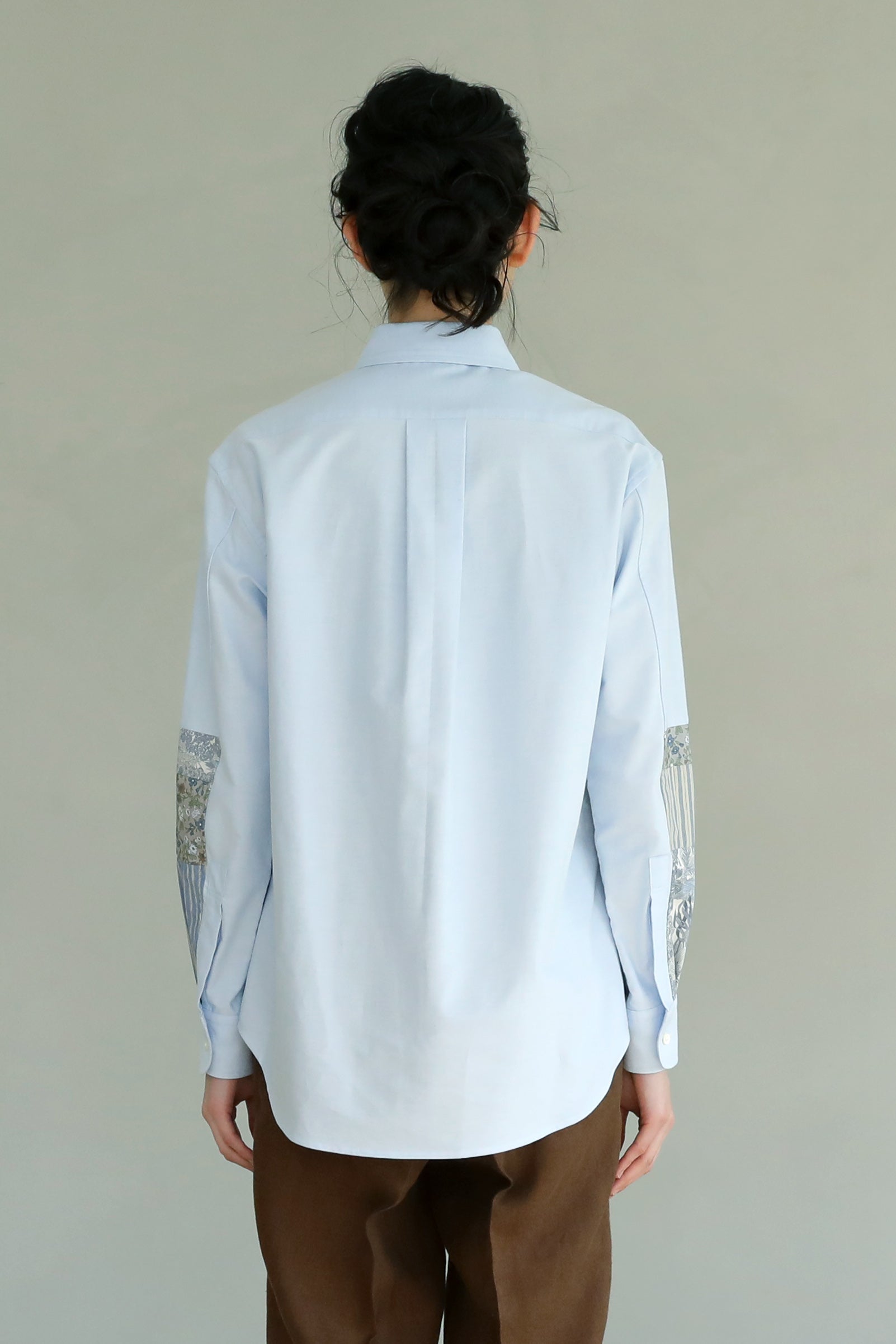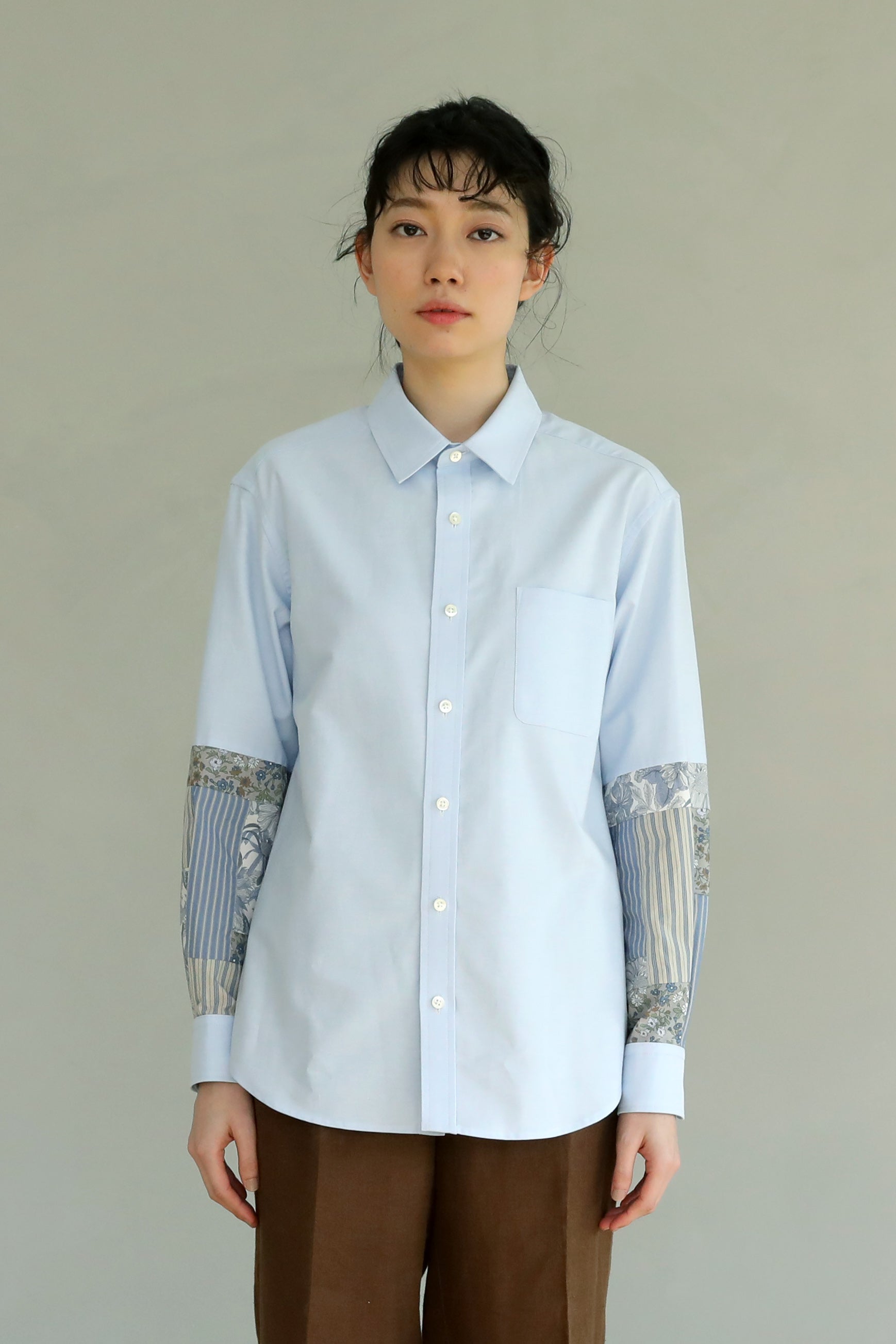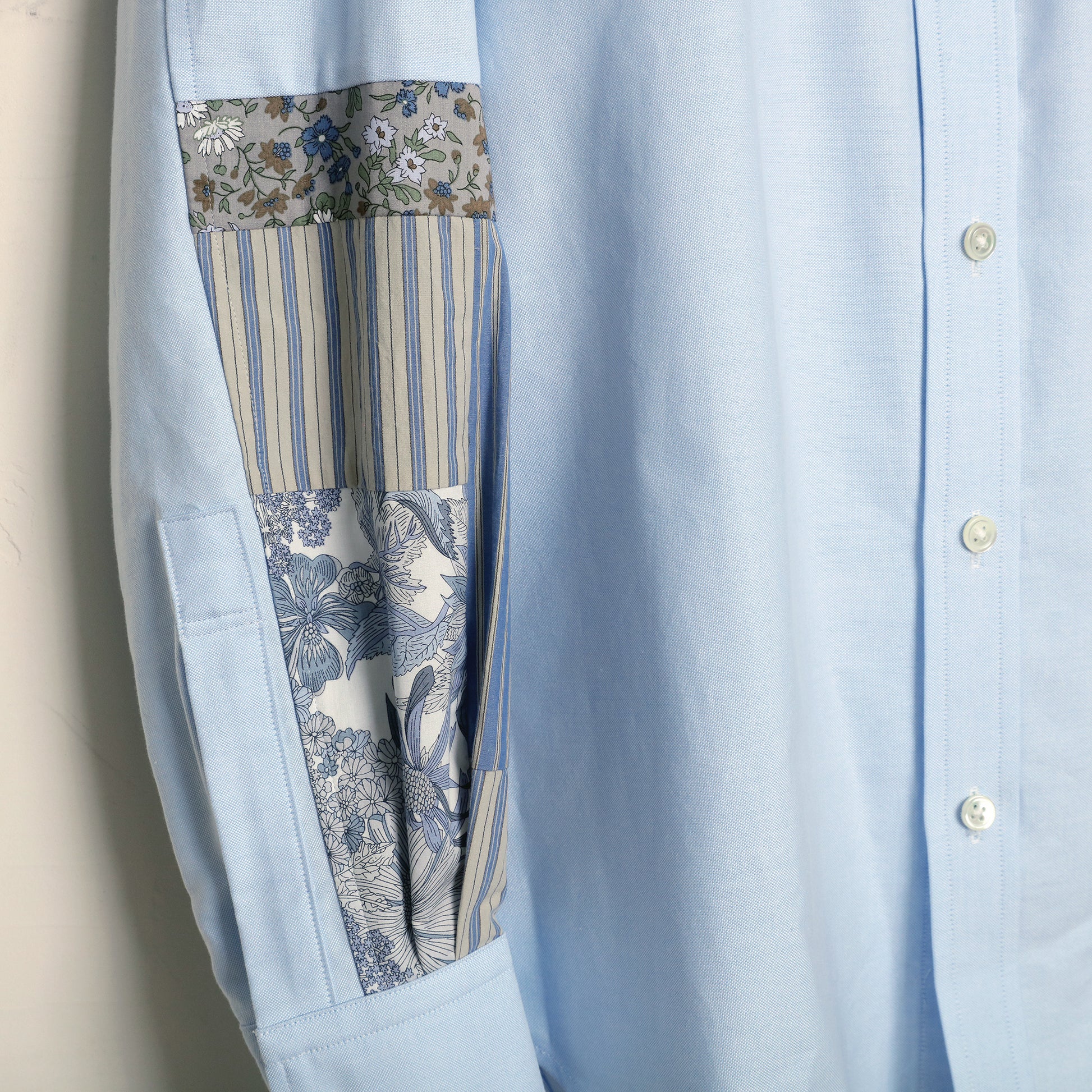 両袖にパッチワークを施した、オックスフォードシャツです。パッチワーク部分にはリバティプリントなどのデッドストック生地を使用しています。