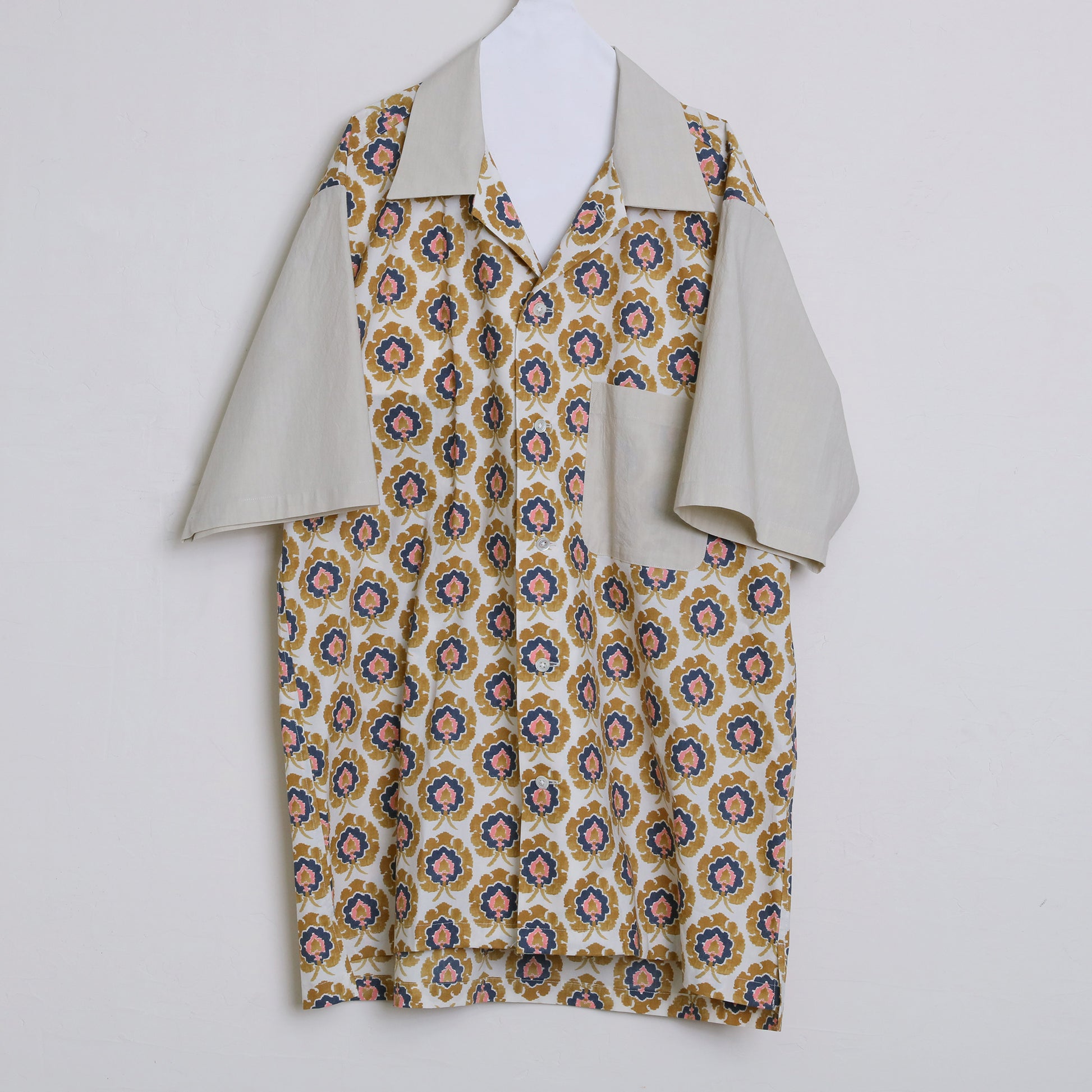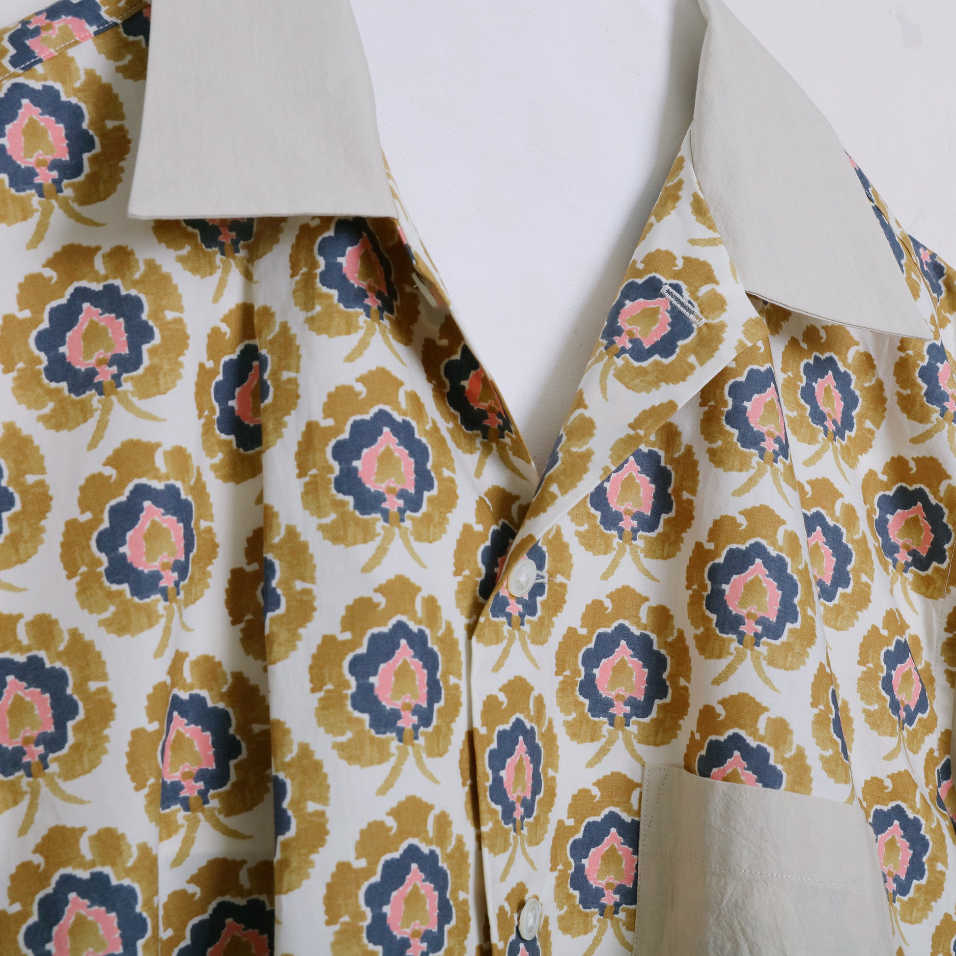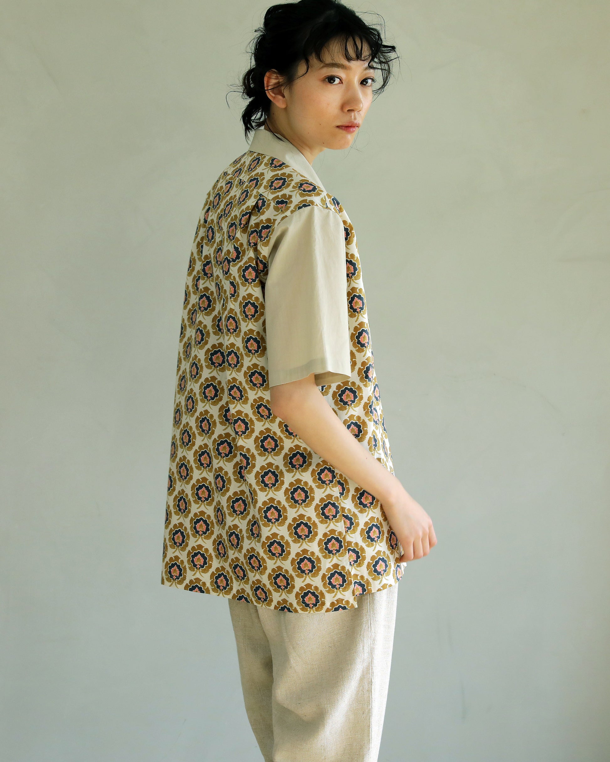 コーディネートの幅が広がるアースカラーの開襟シャツ。身頃にはリバティプリントの生地「タナローン」を使用。袖の生地はシワ加工を施しているので、肌に貼り付かず、蒸し暑い夏でもサラッと快適に過ごせます。