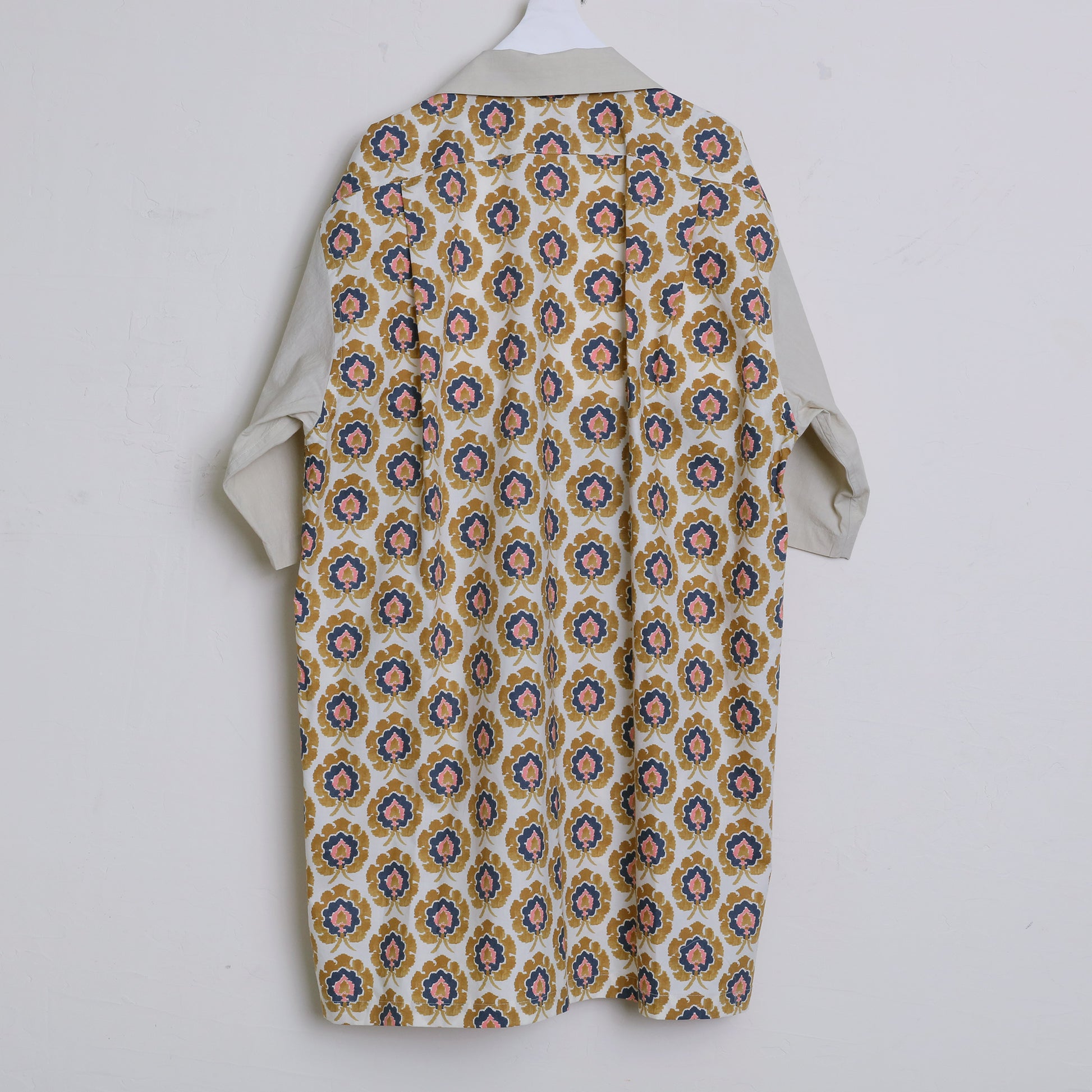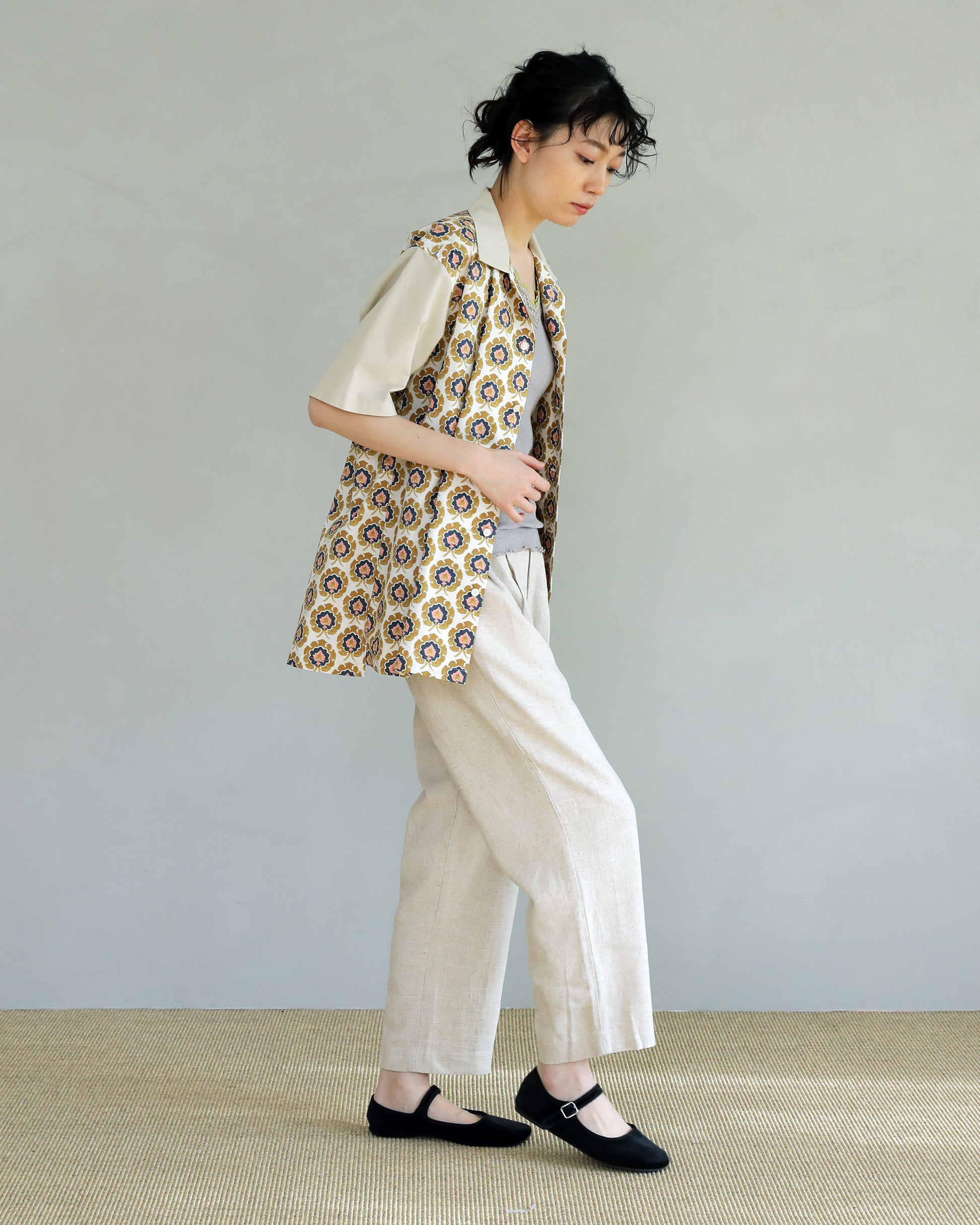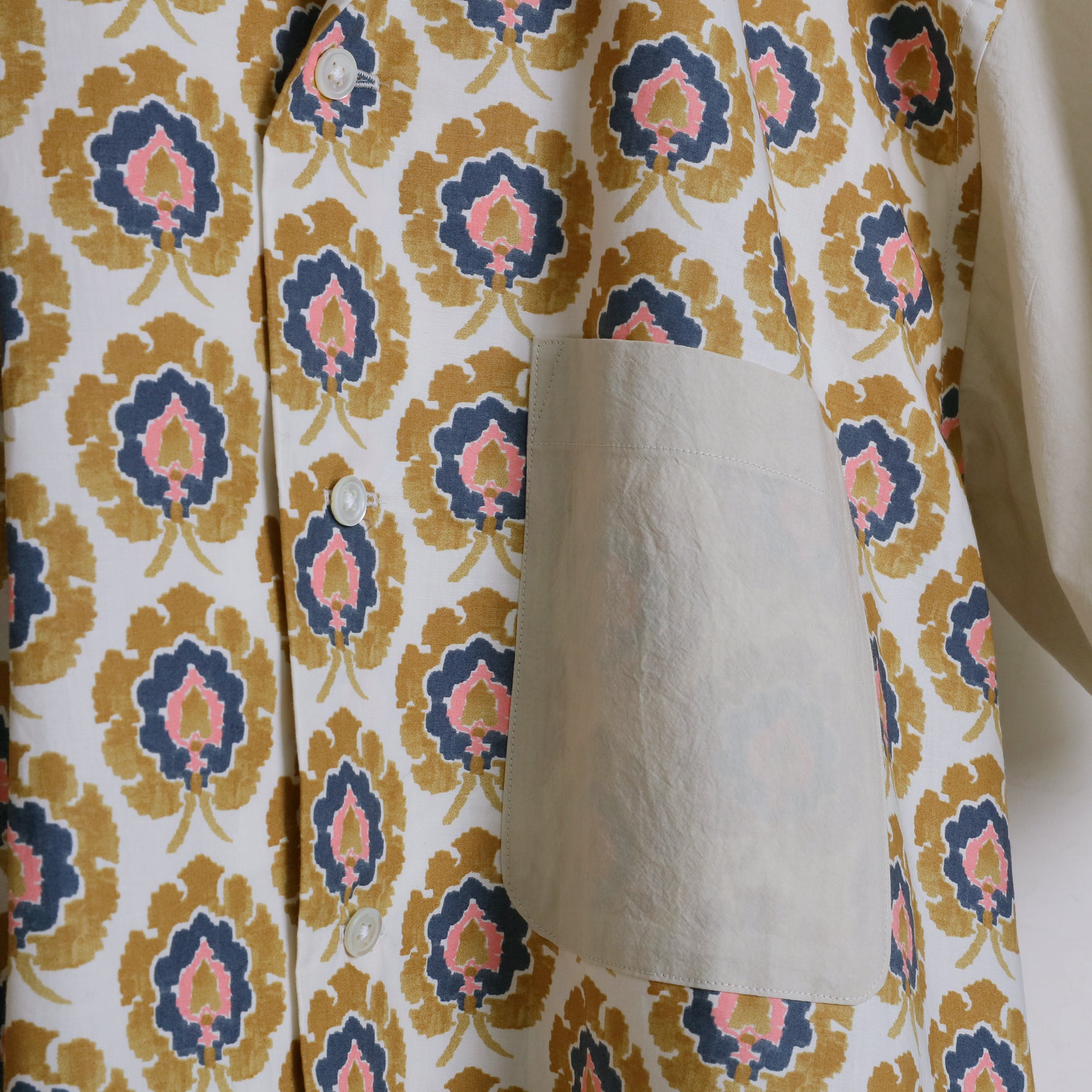コーディネートの幅が広がるアースカラーの開襟シャツ。身頃にはリバティプリントの生地「タナローン」を使用。袖の生地はシワ加工を施しているので、肌に貼り付かず、蒸し暑い夏でもサラッと快適に過ごせます。