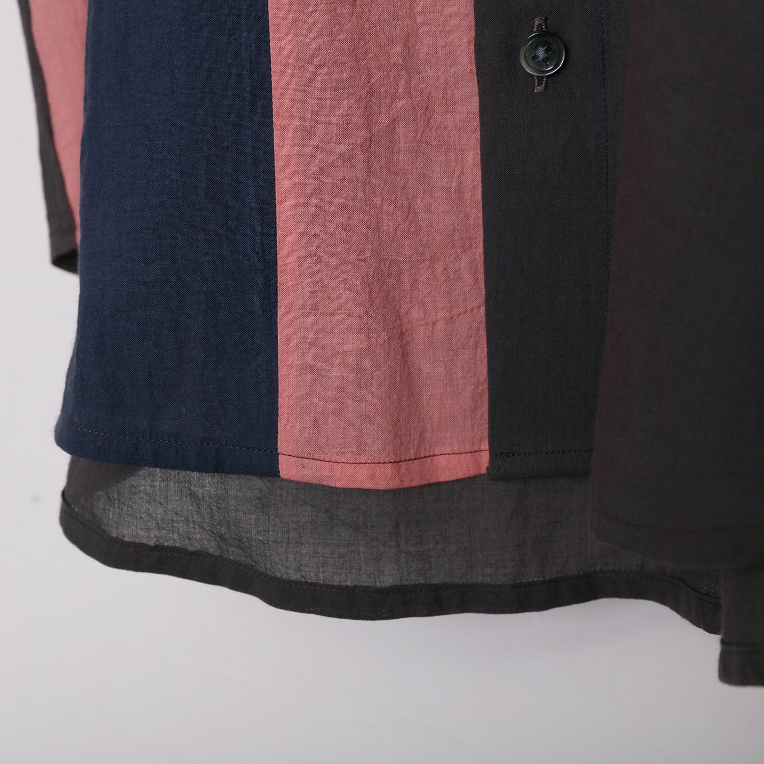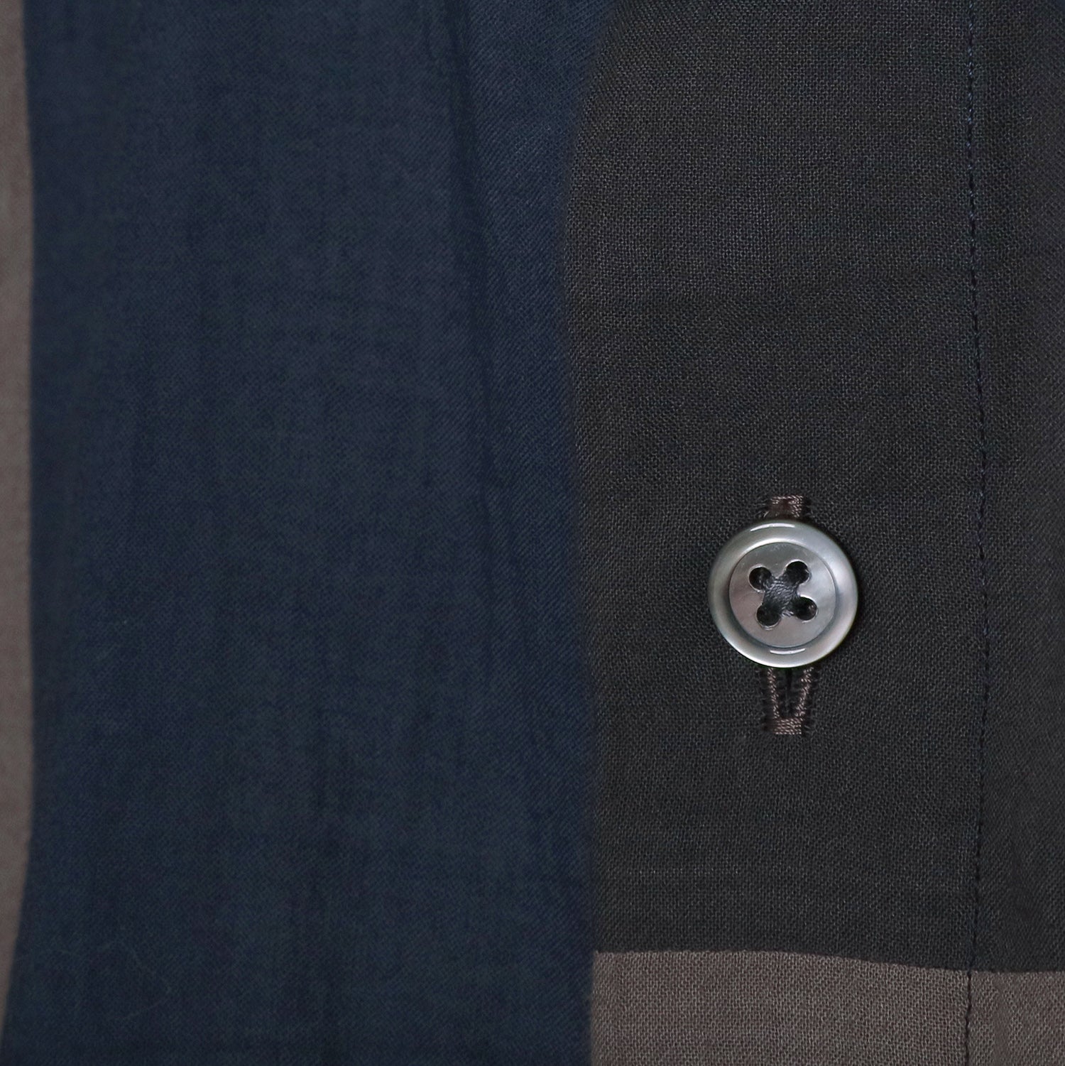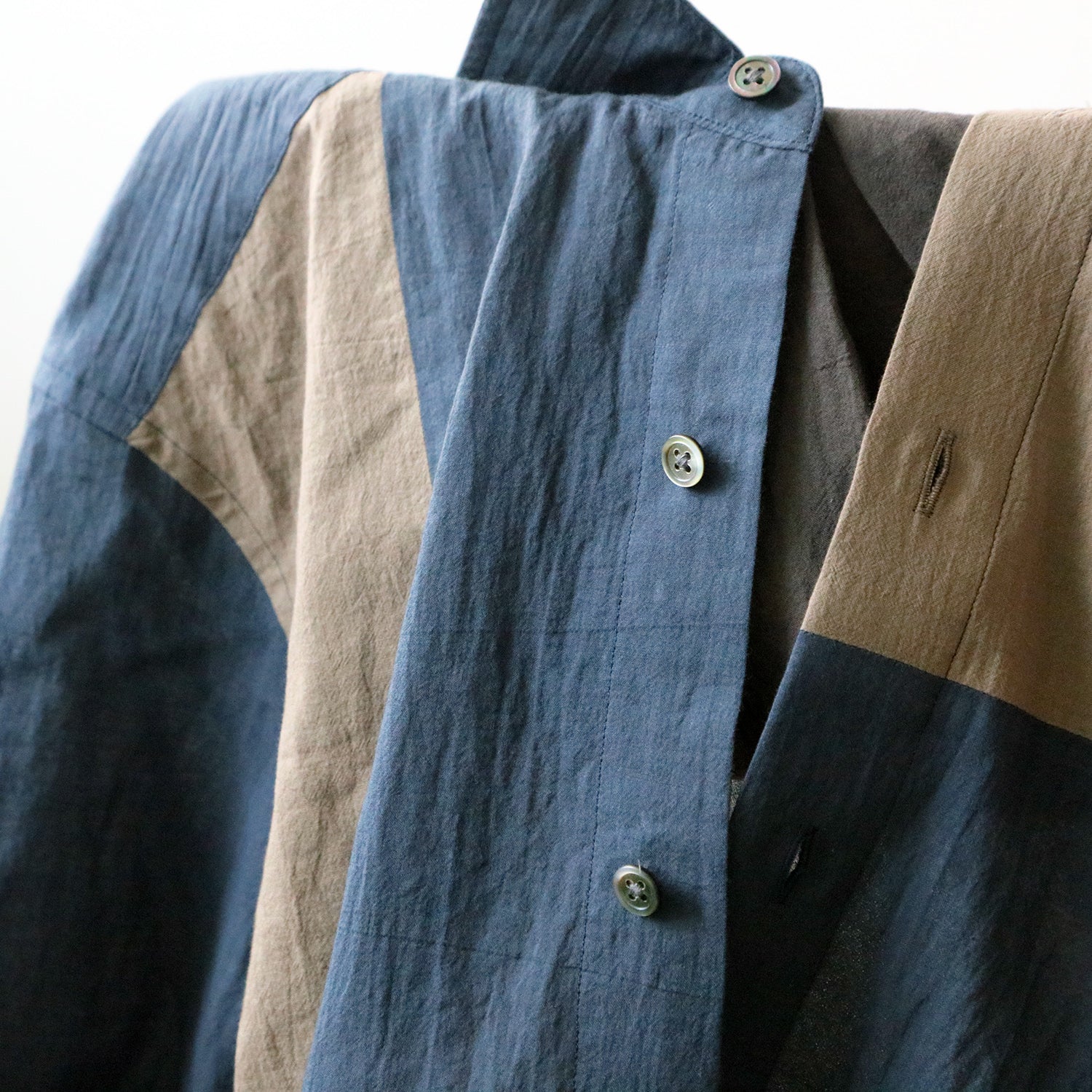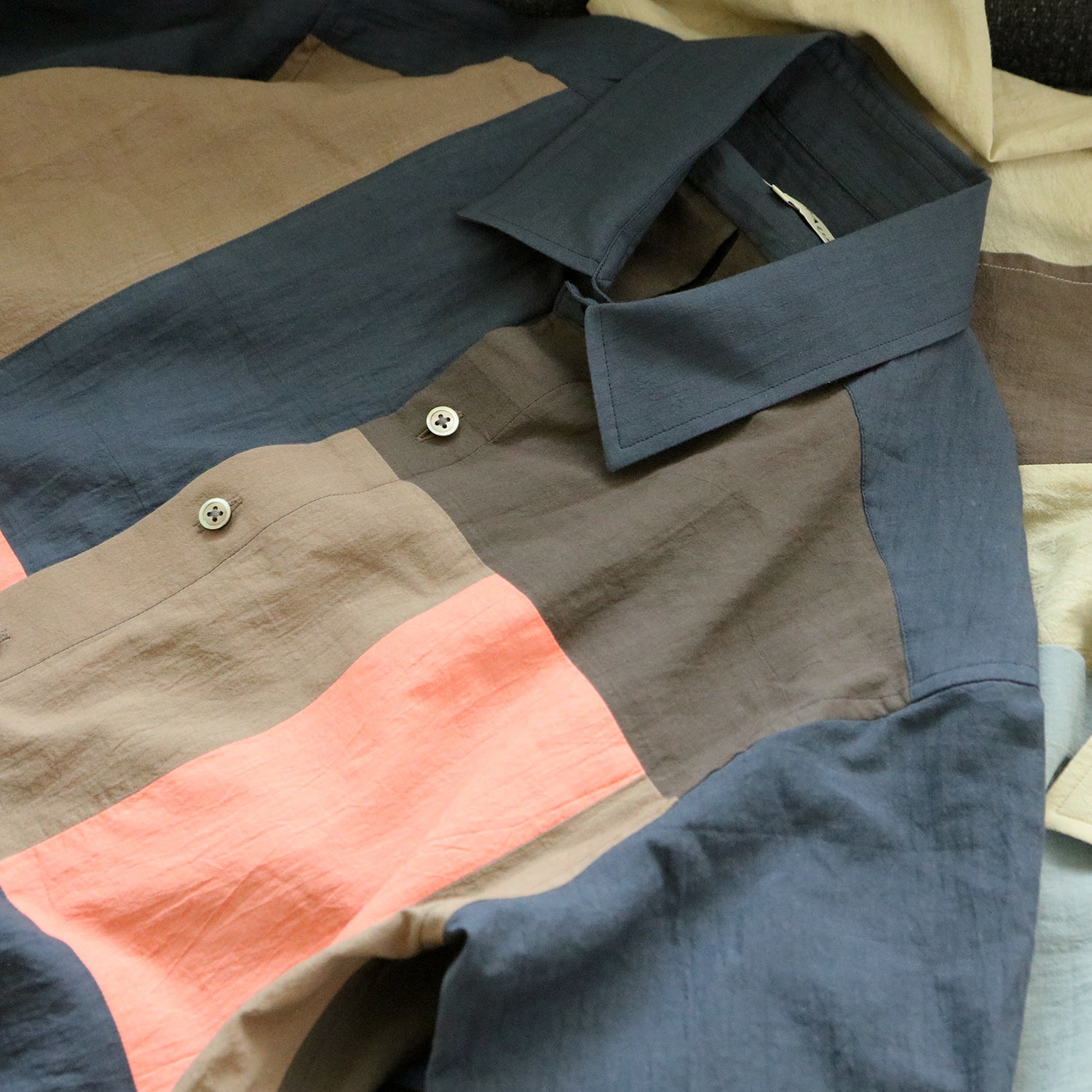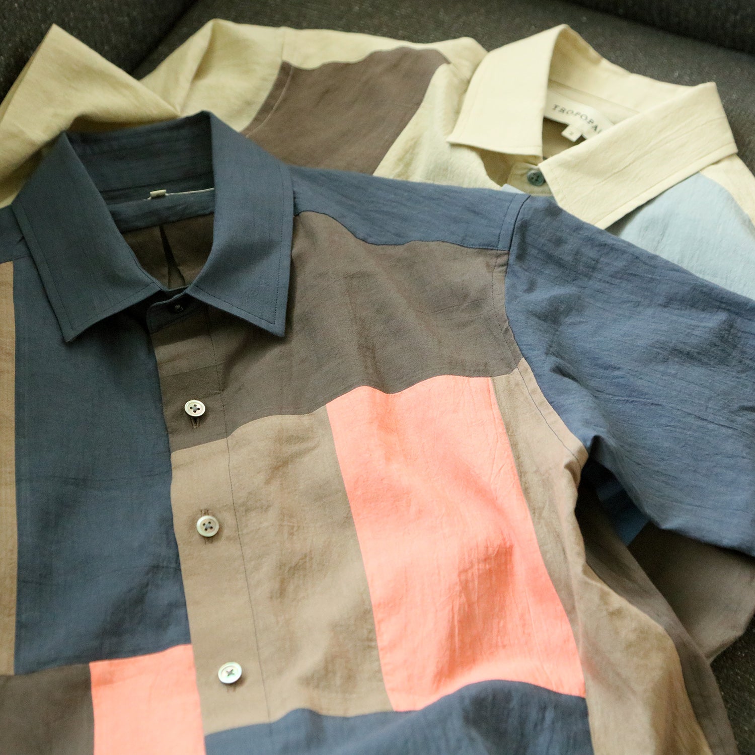 精緻なパッチワークと、黒蝶貝ボタン、裏側の丁寧な処理など、トロポポーズらしいモノづくりへのこだわりと、品質の良さを感じていただけるシャツです。