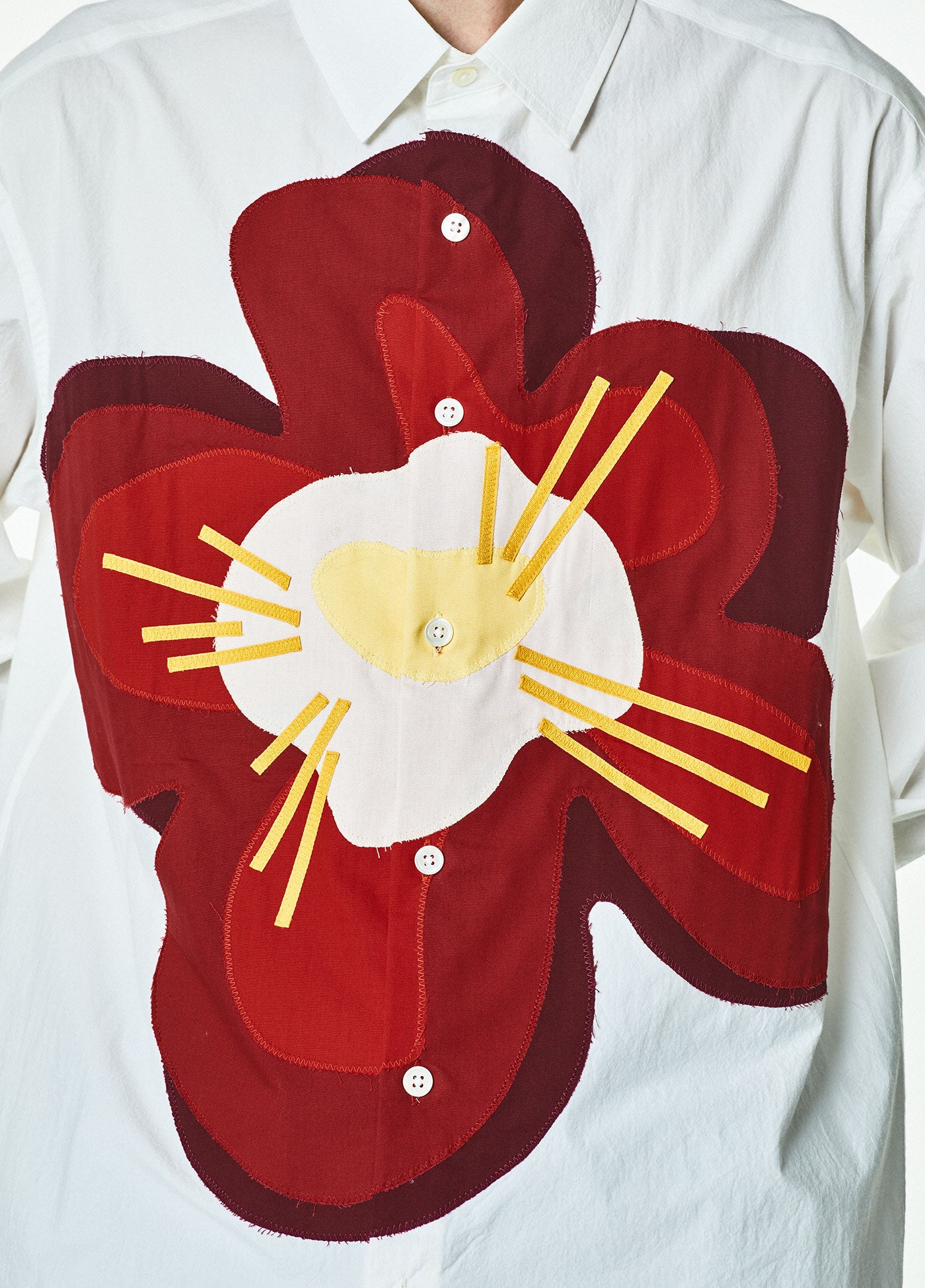 大胆なフラワーモチーフをあしらった個性あふれるパッチワークシャツ。1枚ずつ職人が丁寧に仕立てる、二枚袖仕様の日本製です。シャツ生地は近江晒の高密度タイプライターを使用。コーディネートを格上げしてくれるような、風合いのある上質な質感です。