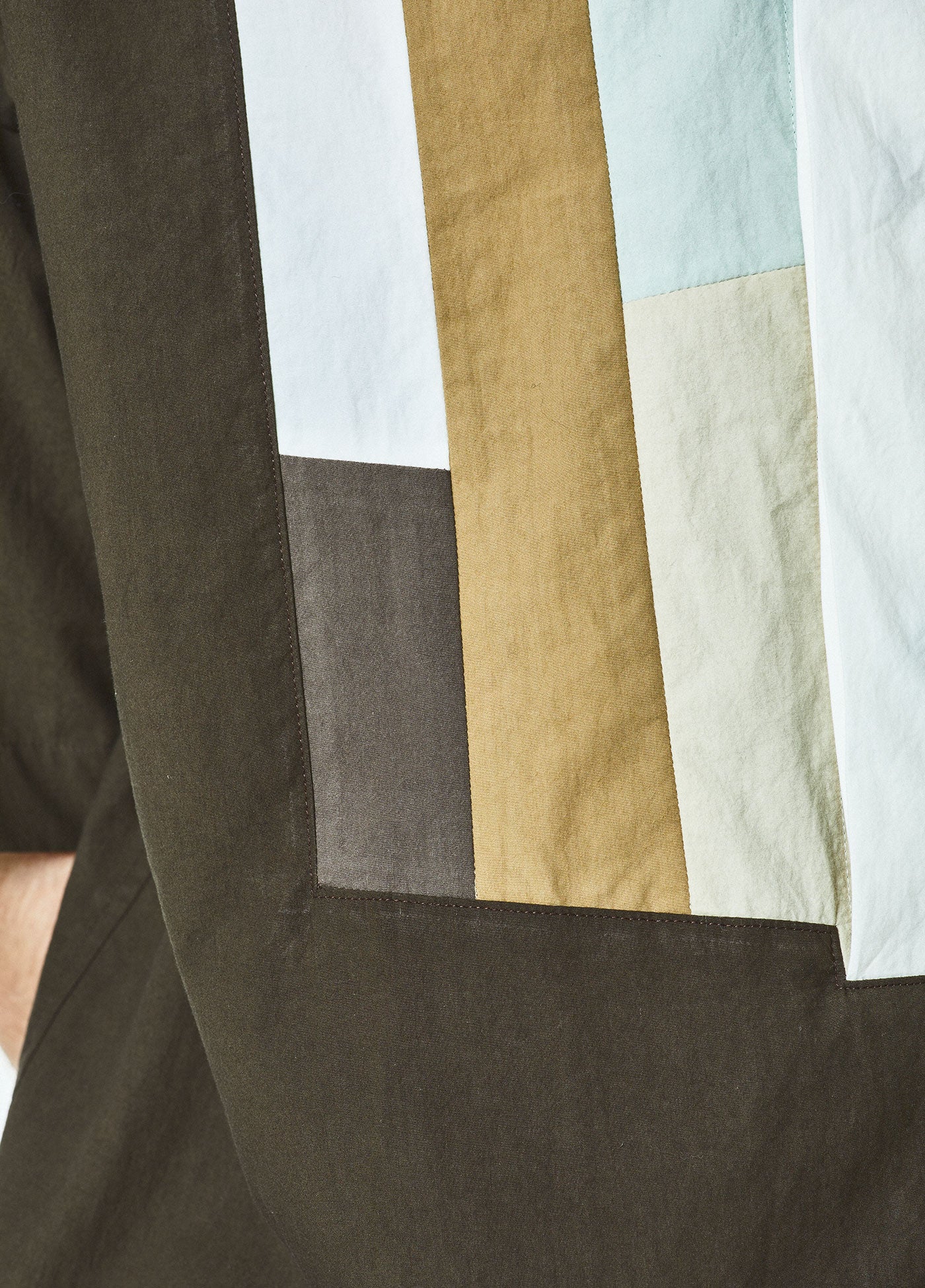 抽象画のようなモチーフのパッチワークを施した半袖シャツ。ボタンの隠れる比翼仕立てて、すっきりと上質なシルエットがポイント。シワ感があり、風合いのいい近江晒の高密度タイプライターをシャツ生地に使用しています。