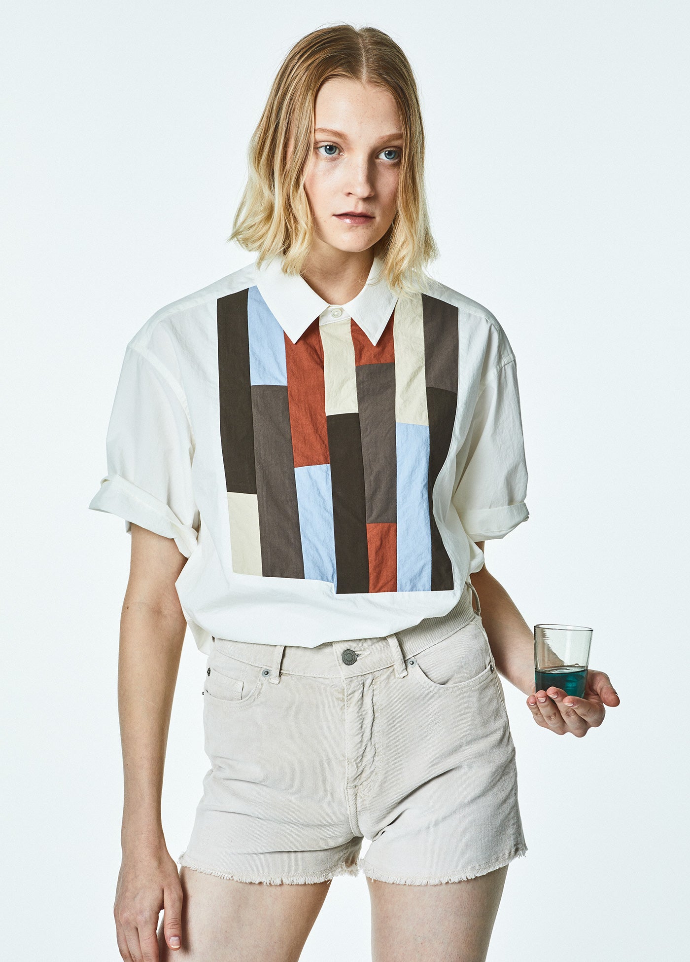 抽象画のようなモチーフのパッチワークを施した半袖シャツ。ボタンの隠れる比翼仕立てて、すっきりと上質なシルエットがポイント。シワ感があり、風合いのいい近江晒の高密度タイプライターをシャツ生地に使用しています。