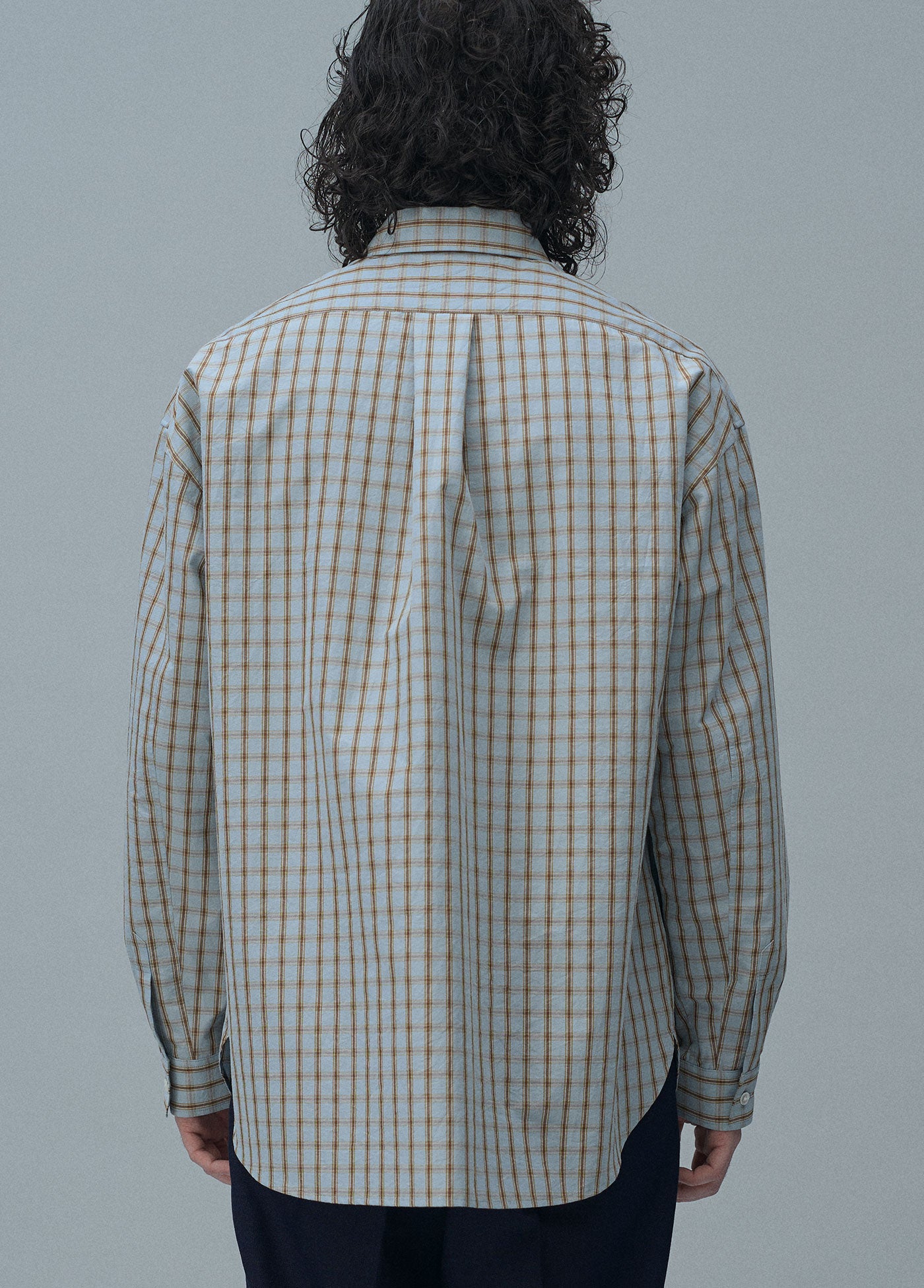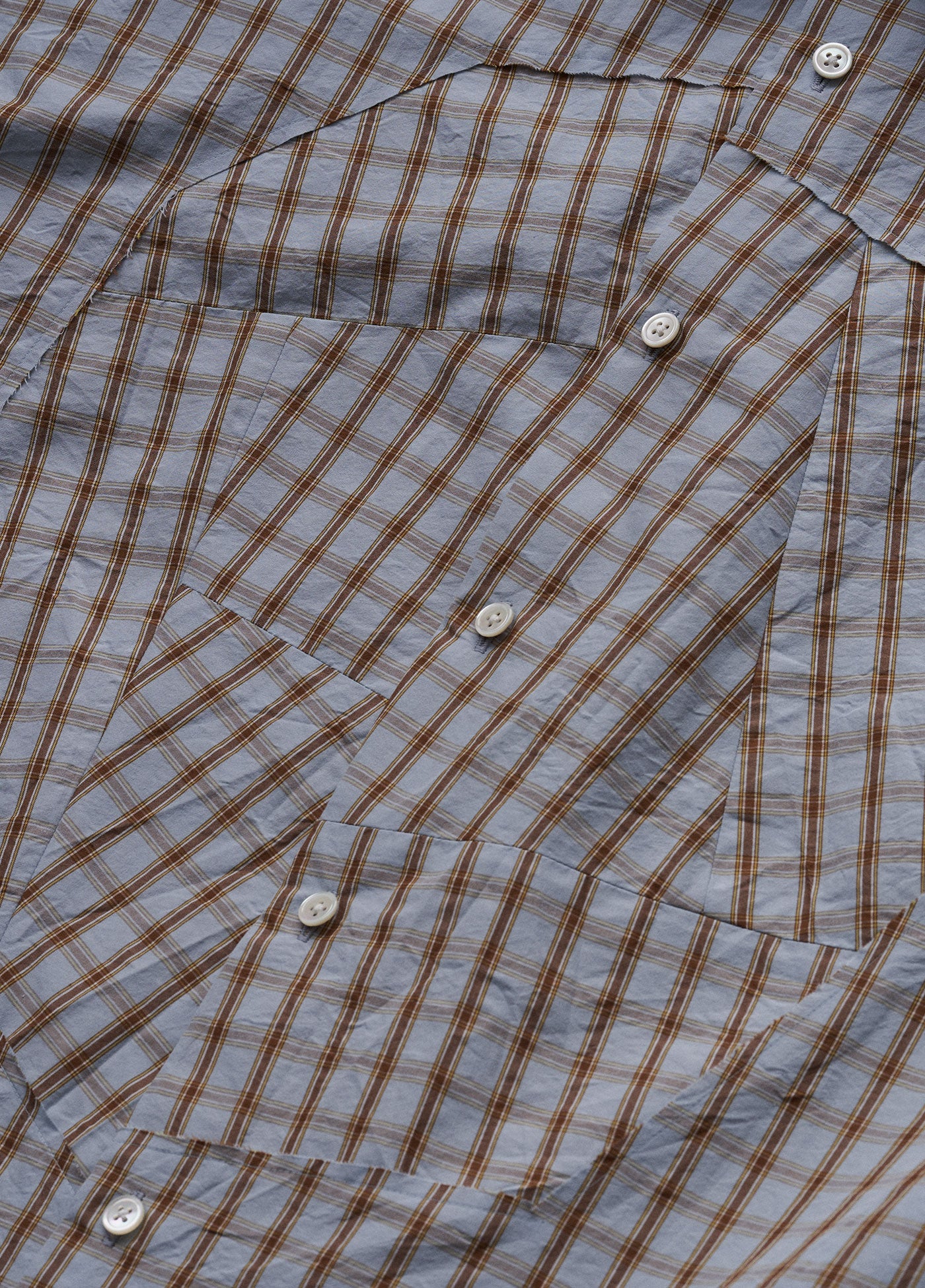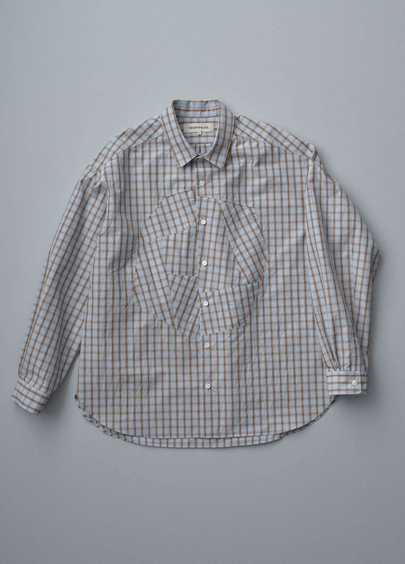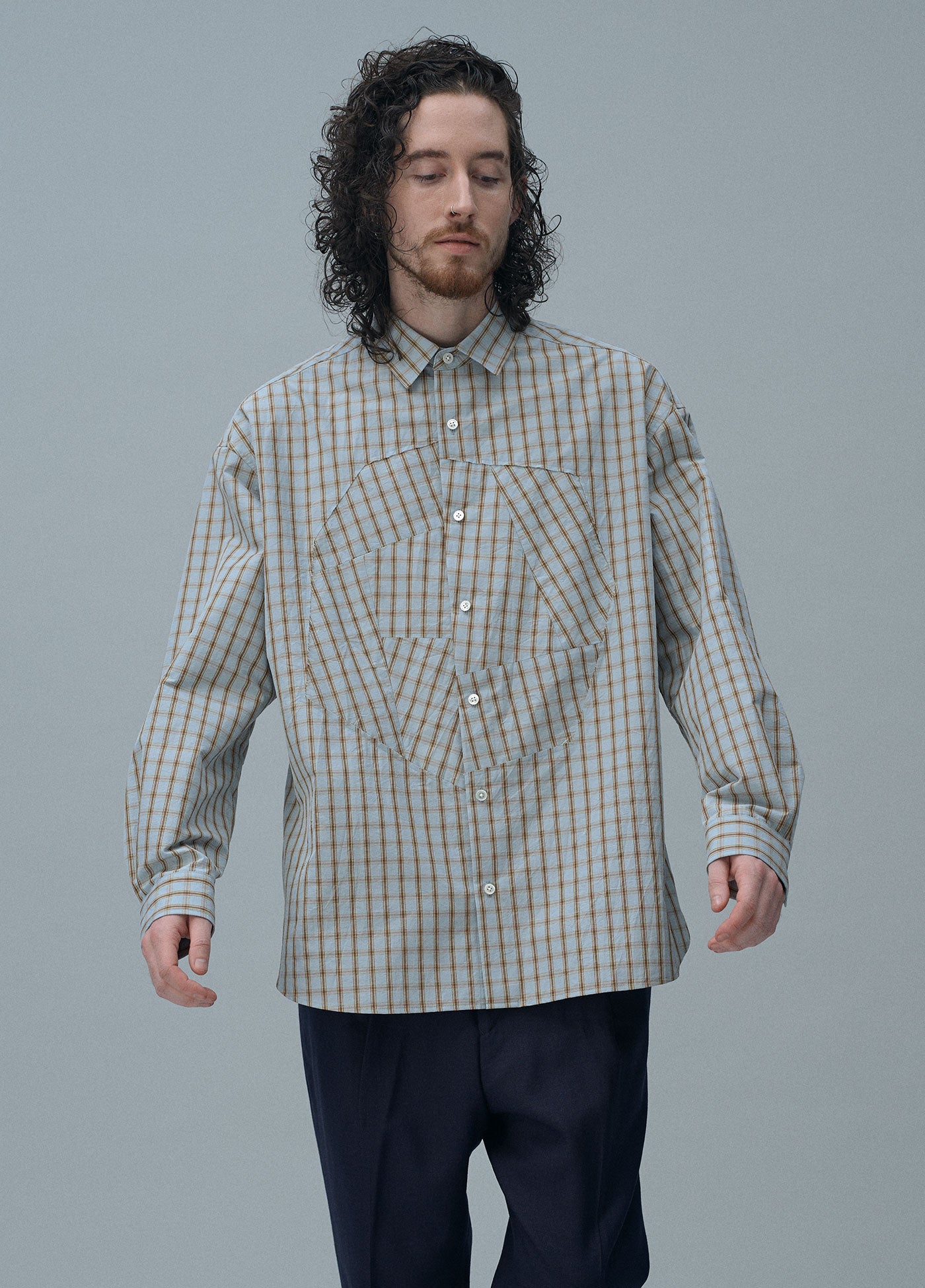 チェックの生地は、向きを変えるだけでちょっとした違和感が生まれます。そんな服の中のおかしさを肯定的に捉えてデザイン要素としました。遠くから見るとだまし絵のようでもあり、近づいてみると1枚のシャツとしての不思議な魅力も感じられます。