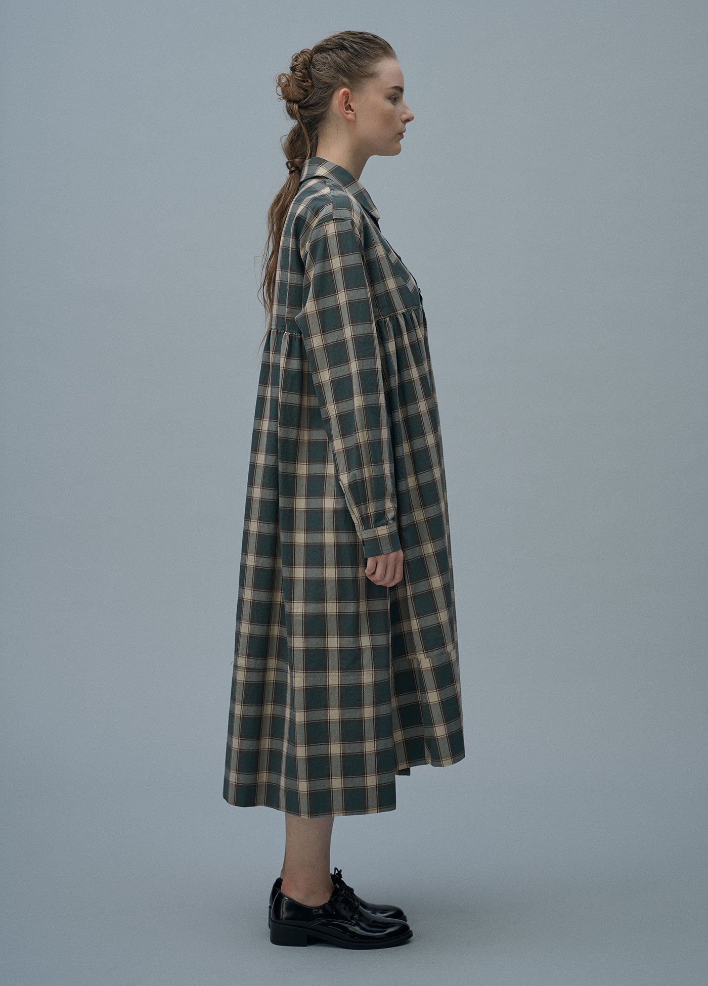 5月のMONTHLYコレクションでは、初夏にふさわしい軽やかなパッチワークのワンピースをご用意しています。ふんわりとしたシルエットとパッチワークがポイントになったチェックのワンピース。サイドのスリットや大きめの丸襟、たっぷりとしたボリュームなど、どこか80年代テイストの懐かしさを感じるシルエットです。