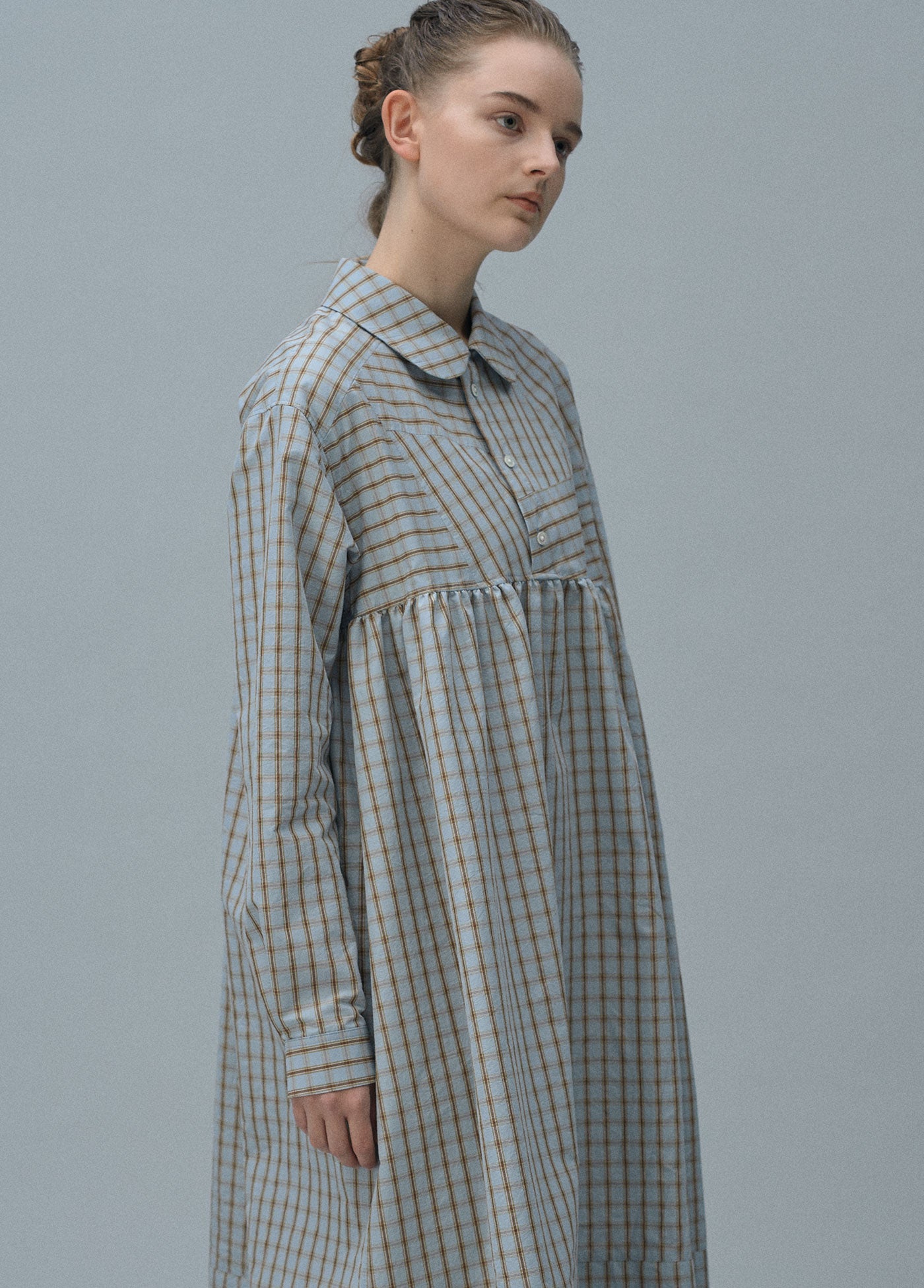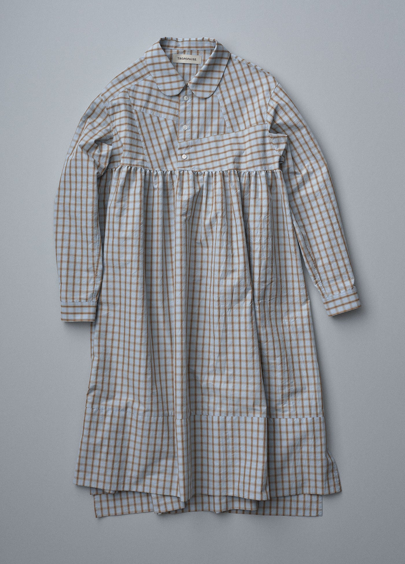 5月のMONTHLYコレクションでは、初夏にふさわしい軽やかなパッチワークのワンピースをご用意しています。ふんわりとしたシルエットとパッチワークがポイントになったチェックのワンピース。サイドのスリットや大きめの丸襟、たっぷりとしたボリュームなど、どこか80年代テイストの懐かしさを感じるシルエットです。