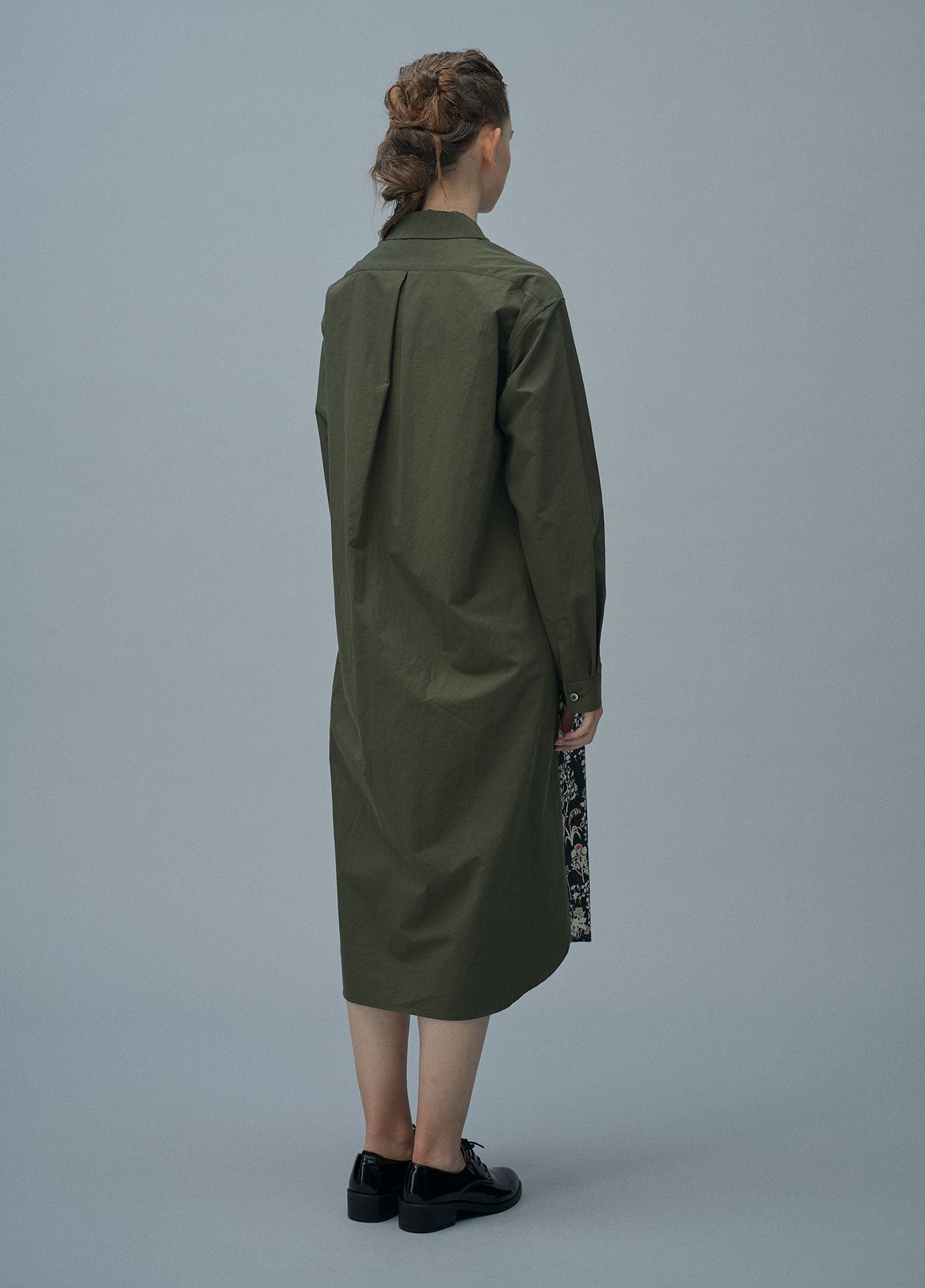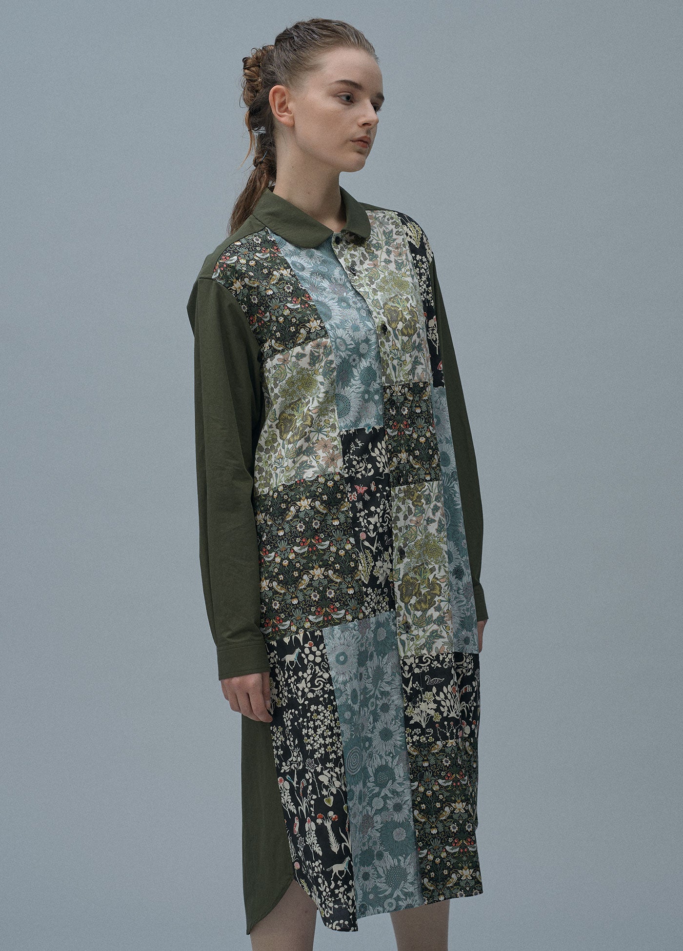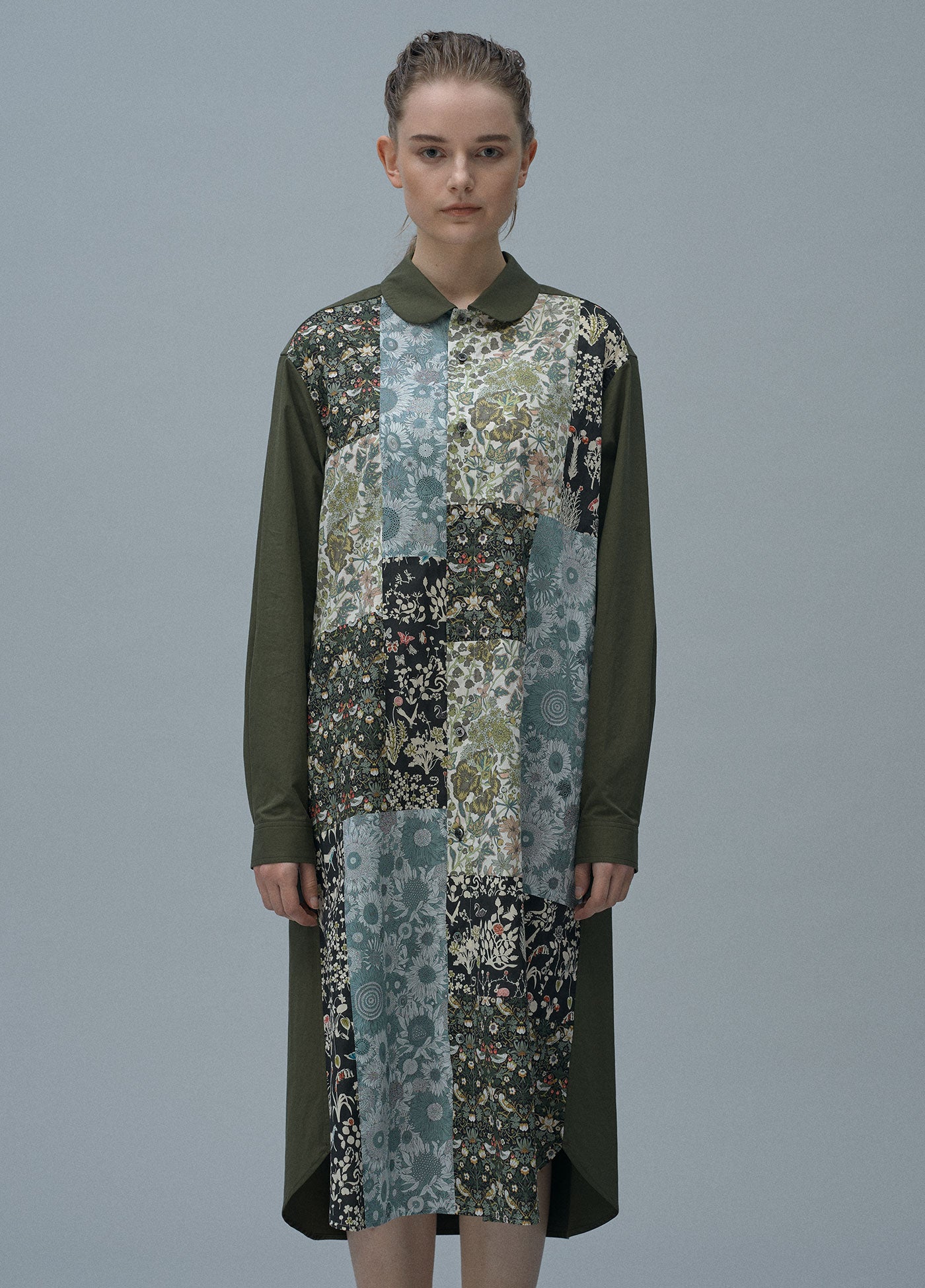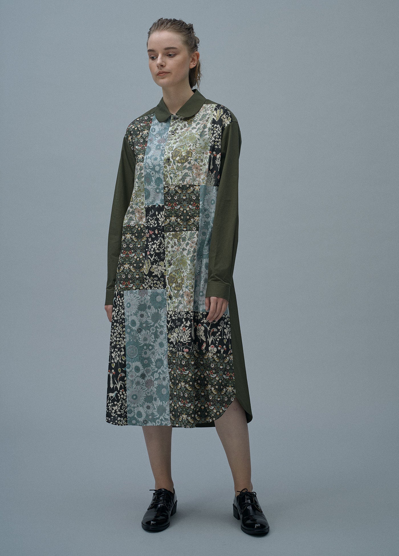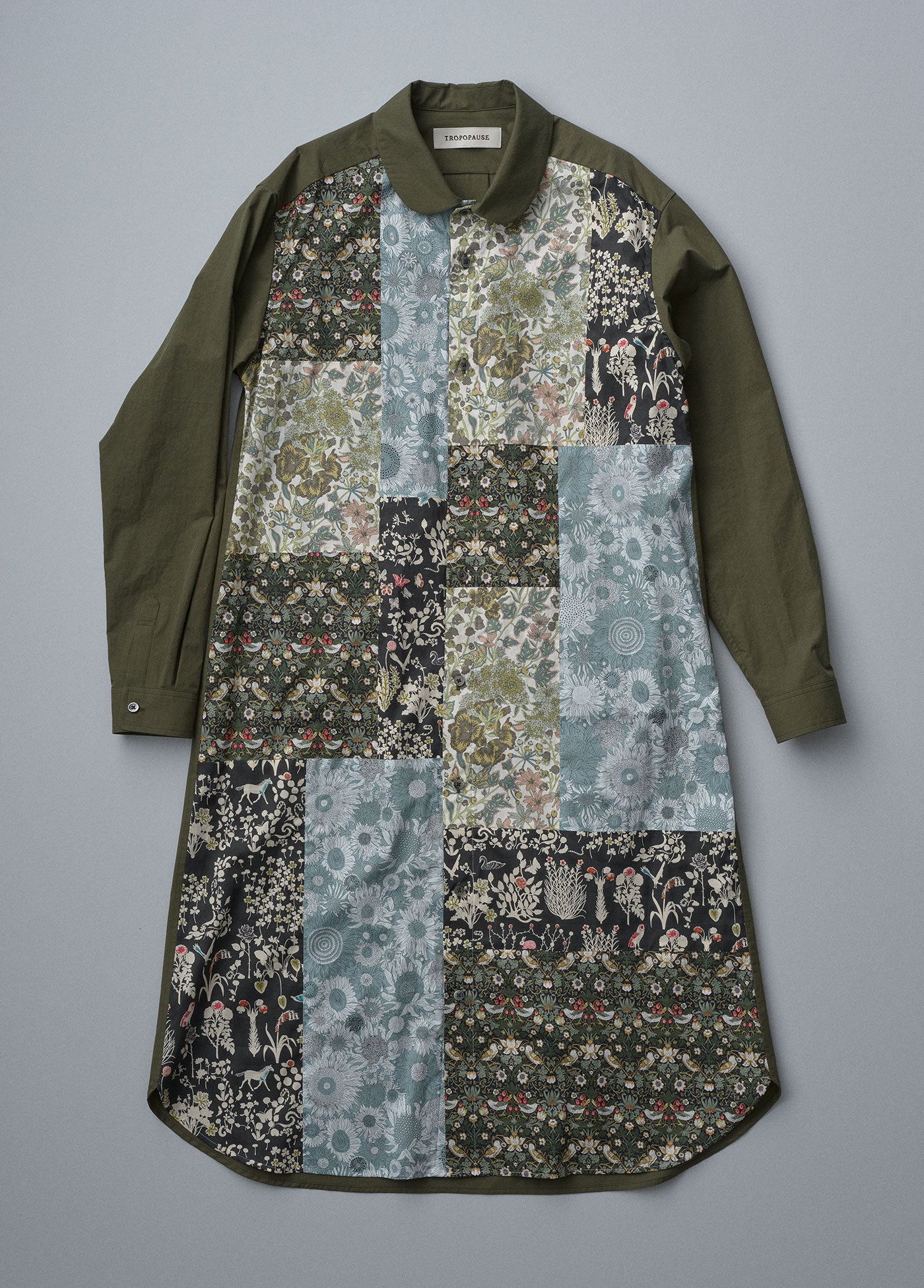 12月のMONTHLYは、シャツに加えて同柄のワンピースもご用意しました。英国リバティプリントの花柄テキスタイルを全面にあしらった丸えりのシャツワンピース。冬は内側にニットを合わせて、春からは前を開けてアウターとして、さまざまな楽しみ方ができる1着です。