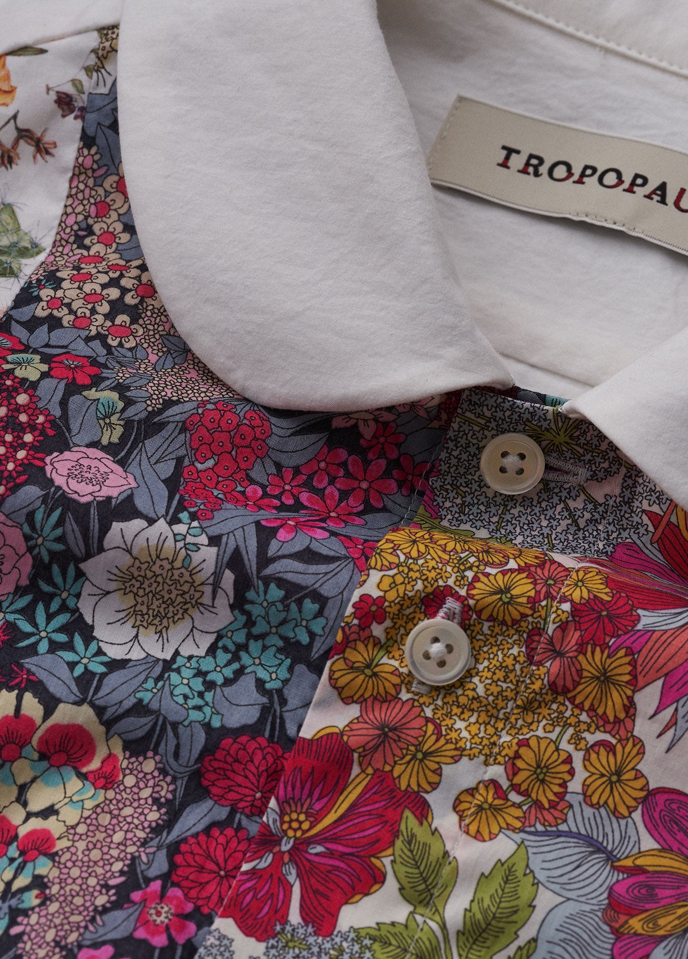 12月のMONTHLYは、シャツに加えて同柄のワンピースもご用意しました。英国リバティプリントの花柄テキスタイルを全面にあしらった丸えりのシャツワンピース。冬は内側にニットを合わせて、春からは前を開けてアウターとして、さまざまな楽しみ方ができる1着です。