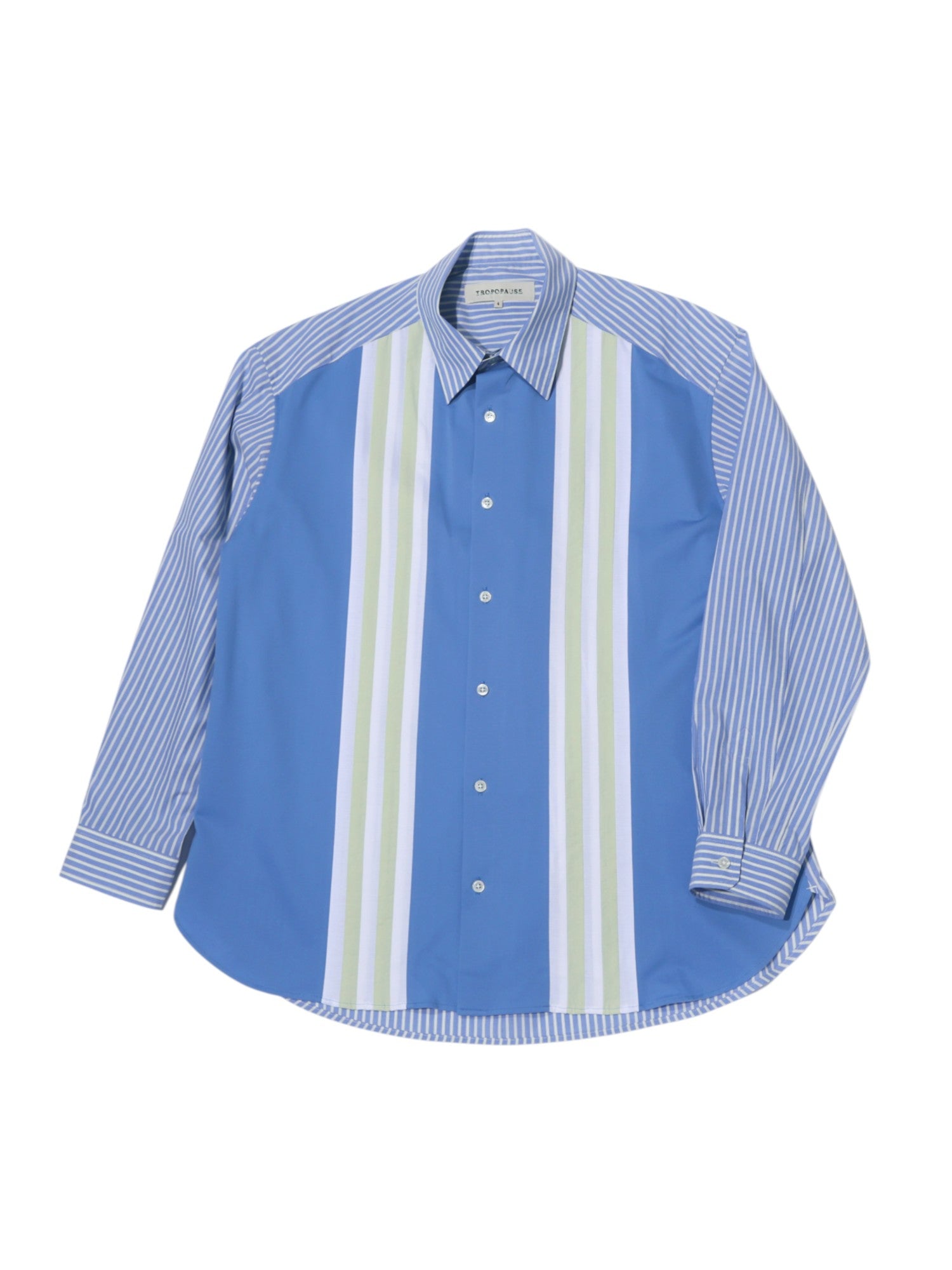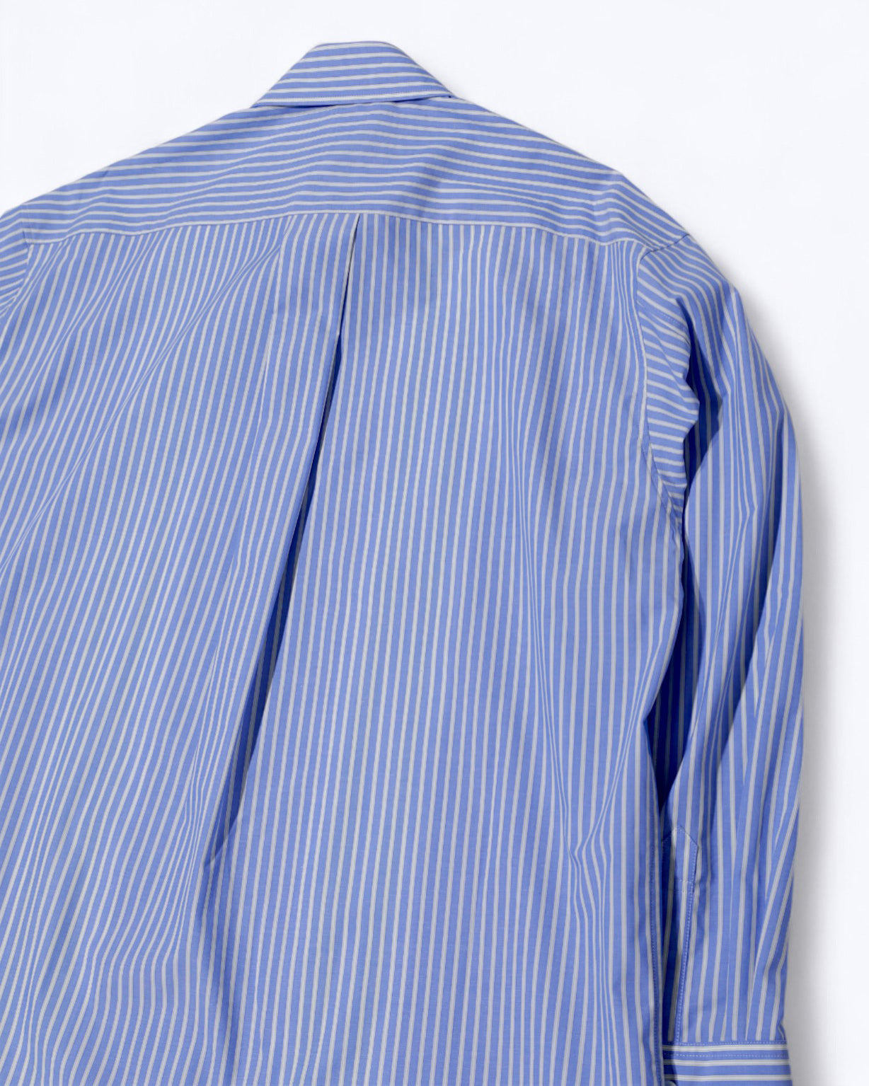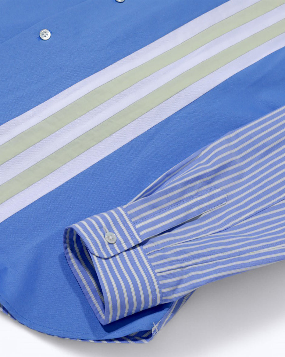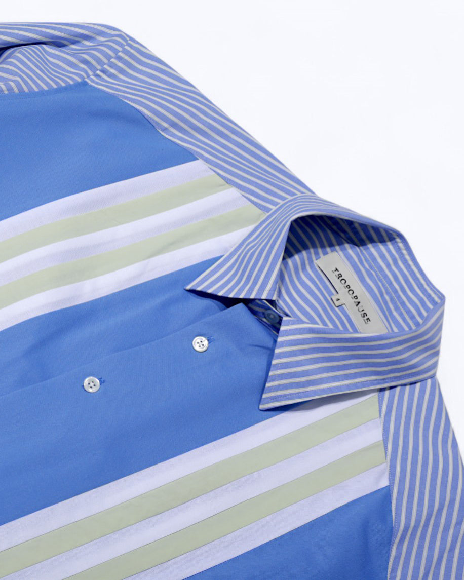 シャツ生地と同じストライプをパッチワークにして前身頃に施しました。