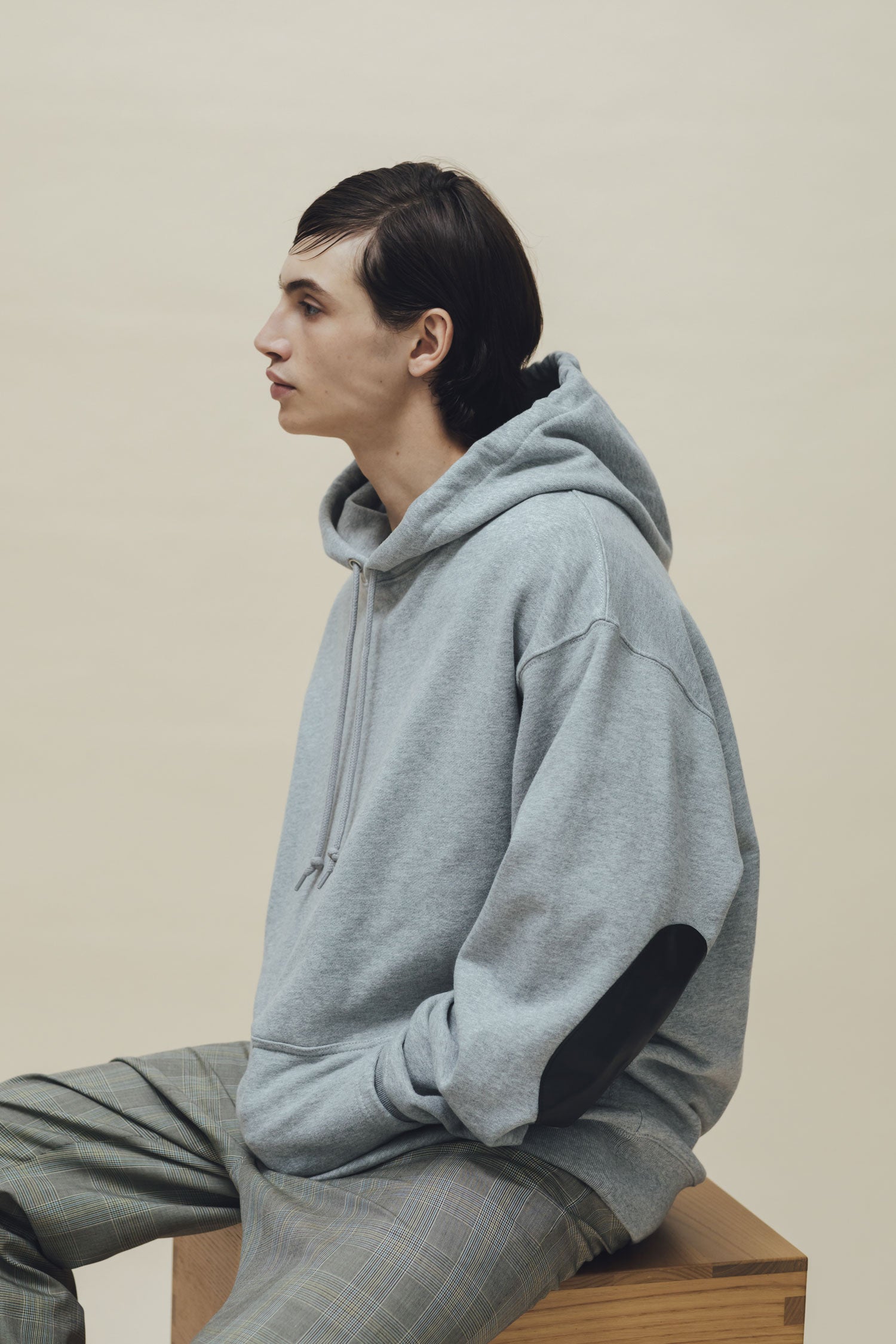 袖には、ウォッシャブルレザーのエルボーパッチつき。カジュアルなアイテムながらも、大人っぽく着こなしていただけます。レザーですがお家で手洗いできるので、気負わず気軽に着られる点もおすすめ。肌寒い日に、リラックスタイムに、なにかと出番の多いフーディです。
