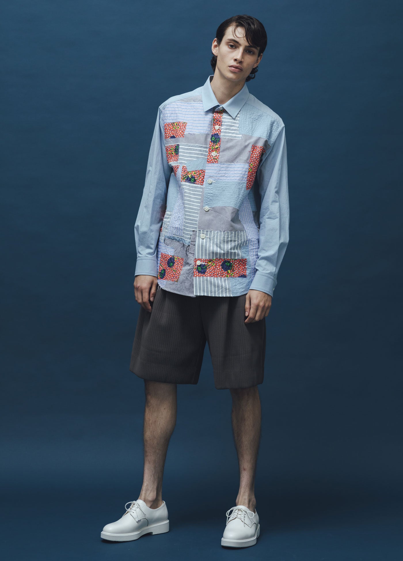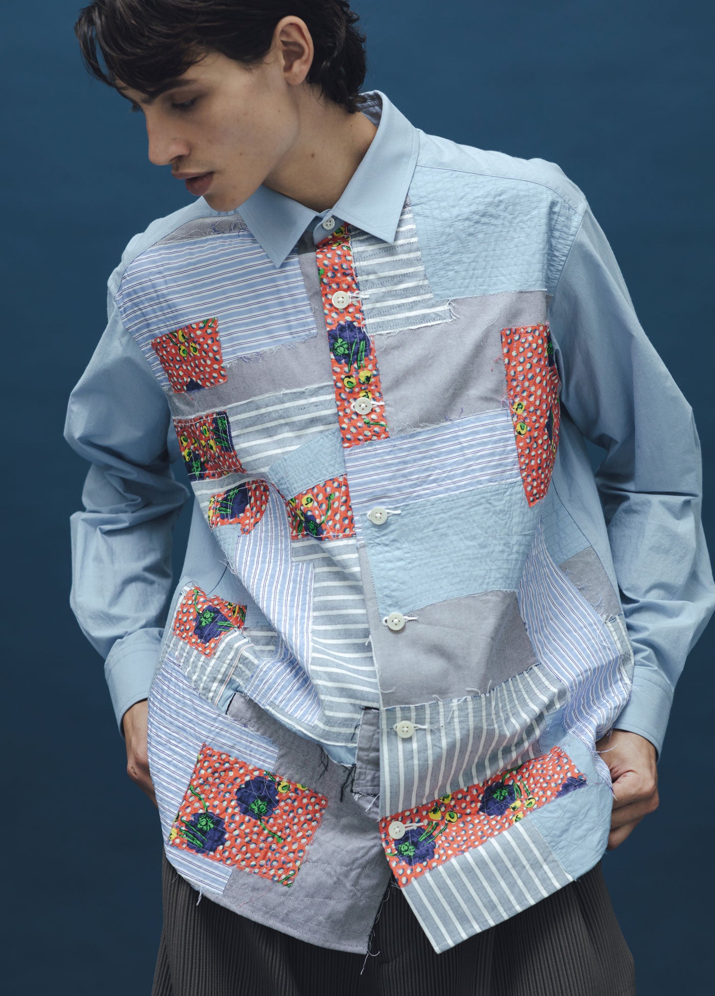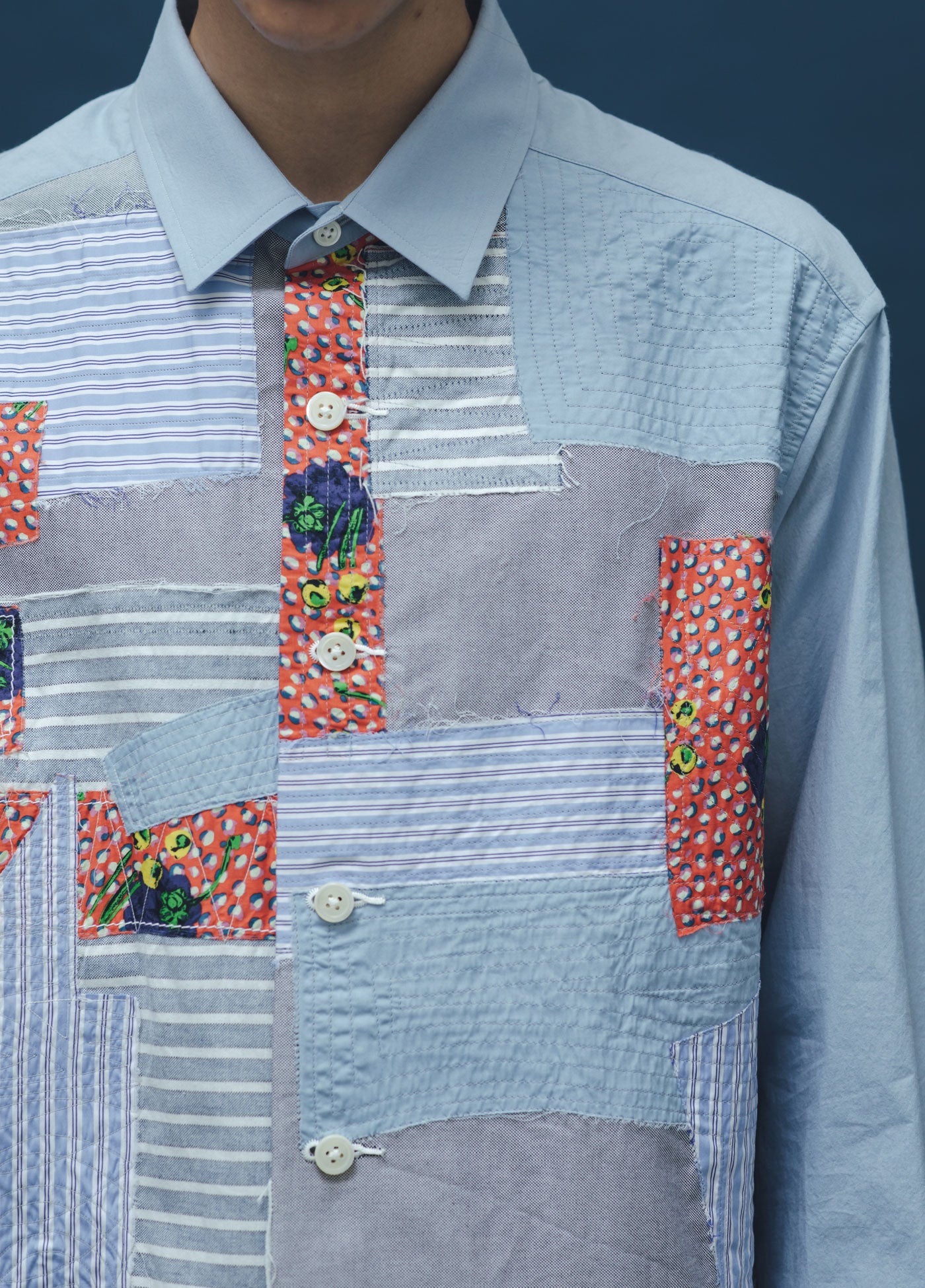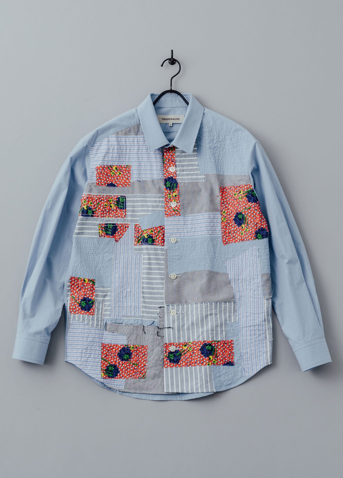 ヨーロッパの上質なデッドストック生地を用いてパッチワークした後、刺し子刺繍を施した、1点もののシャツです。スカイブルーをベースに赤の花柄模様など差し色を加え、1枚ずつデザイナーが手で刺繍を施しました。自由で複雑な刺し子模様と、トロポポーズらしい複雑なパッチワークの色合わせを楽しんでください。