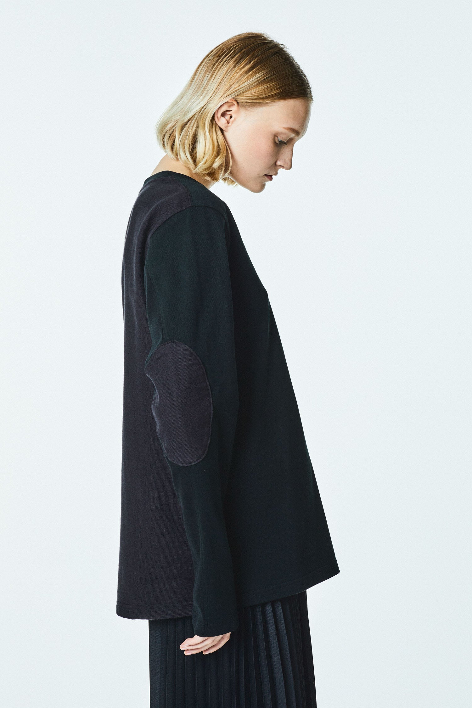 袖はトロポポーズではおなじみ、腕を少し前に振った2枚袖仕様。さりげない異素材の切り替えを楽しんでください。