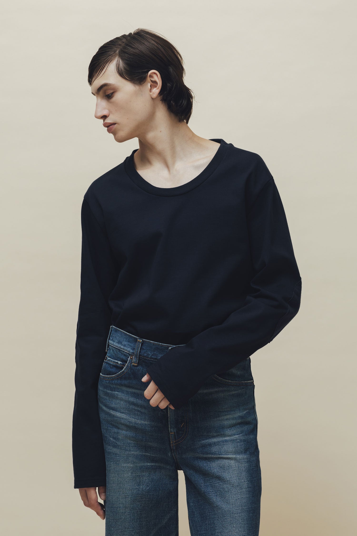 首もとは、首まわりを締めつけず、鎖骨がきれいに見えるオリジナルのUネック。何度も検証を重ね、胸もとが健康的に美しく見える深さと幅、ゆるやかなカーブを探りました。男性はもちろん、女性が着てもデコルテを美しく見せてくれます。