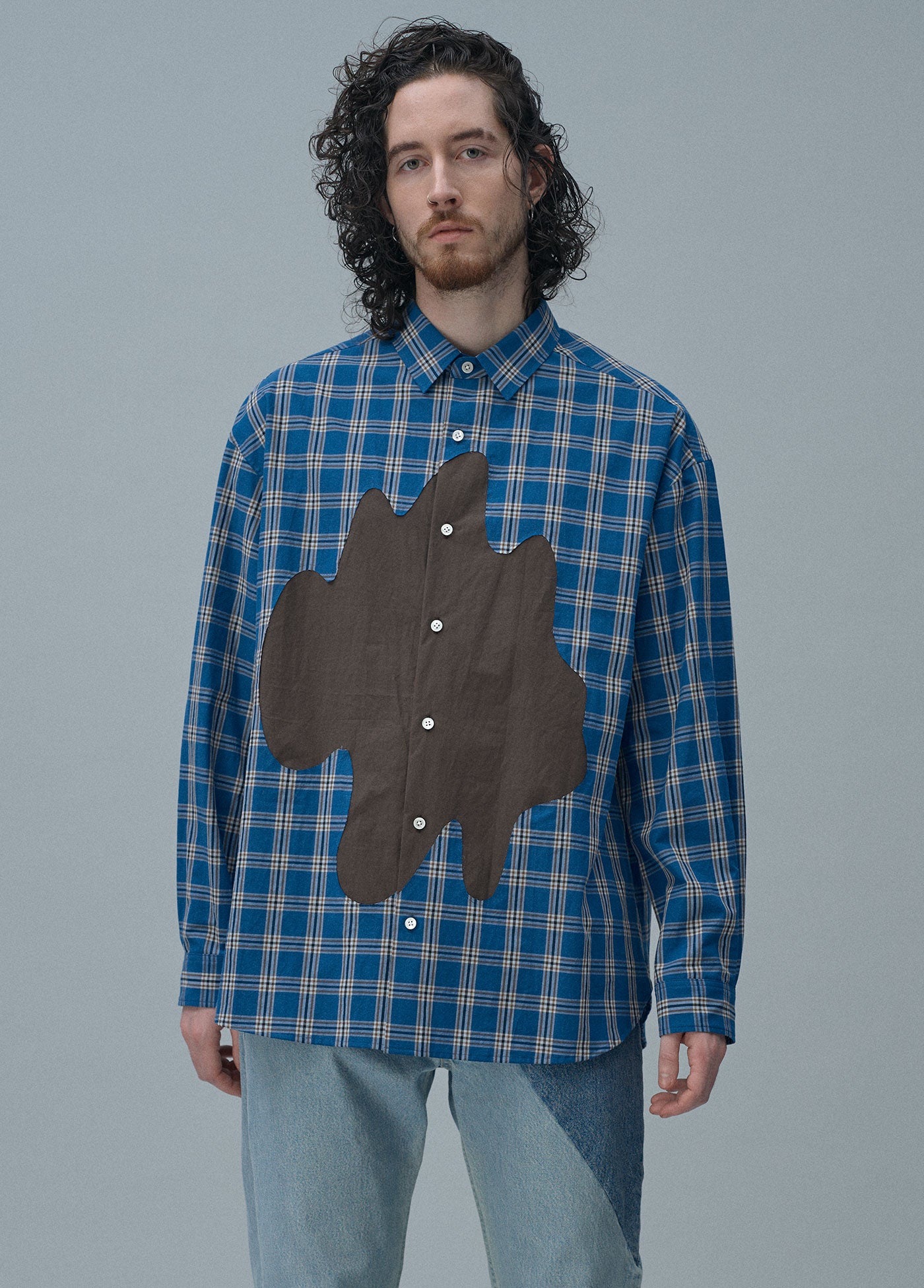 11月のMONTHLYシャツは、インクが飛び散ったような“しみ”のパッチワーク。大胆に繰り抜いたシャツに下から別の生地を充てて、大きな穴のような模様を生み出しました。