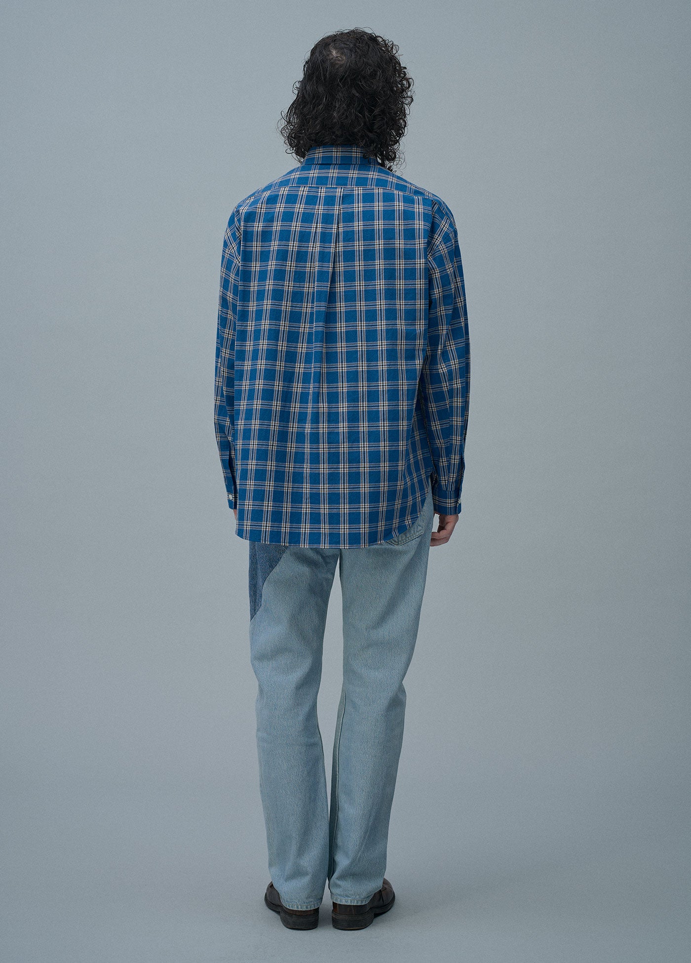 カジュアルに着られるブルーのチェックシャツと、近江晒を施した質感のいいネイビーのコットンシャツ。生地と色合いの異なる2色をご用意しています。