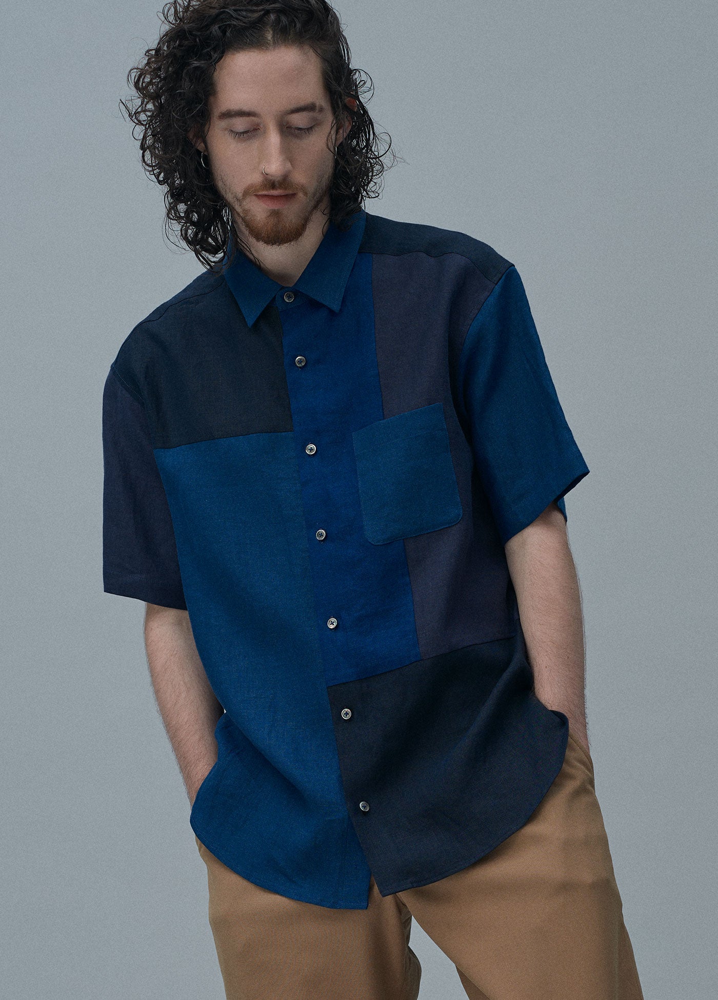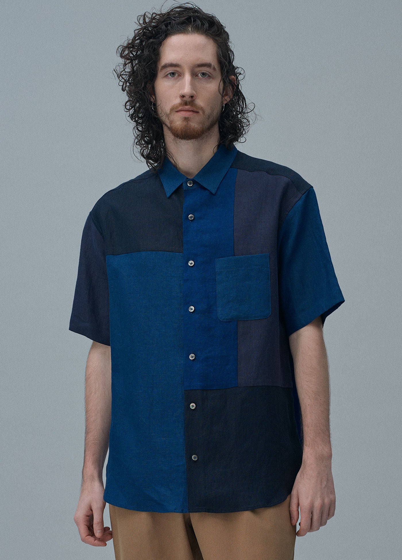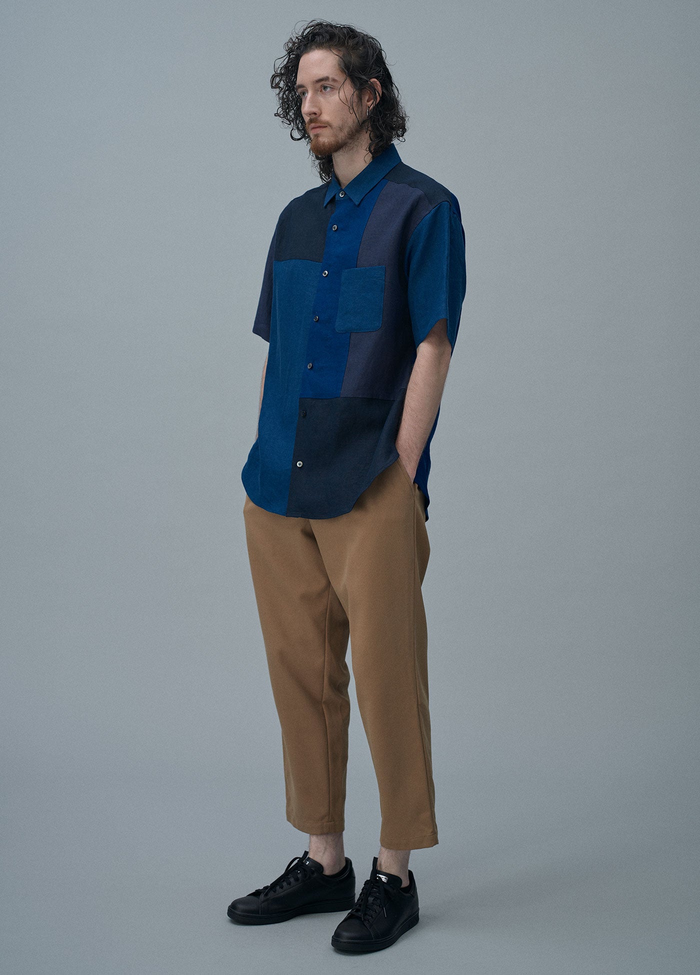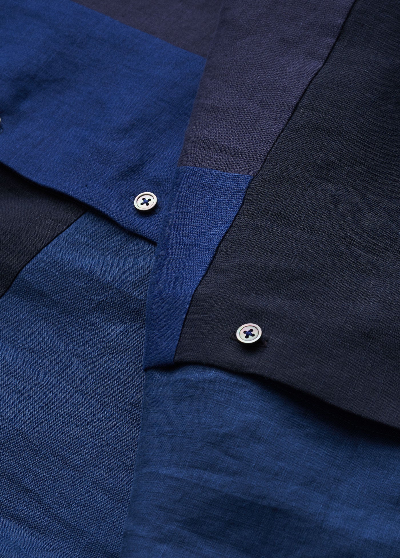 7月のMONTHLYテーマはSHADE。陰影を表すような同系色のリネン生地で構成した、繊細な色合いの違いを楽しむパッチワークシャツです。