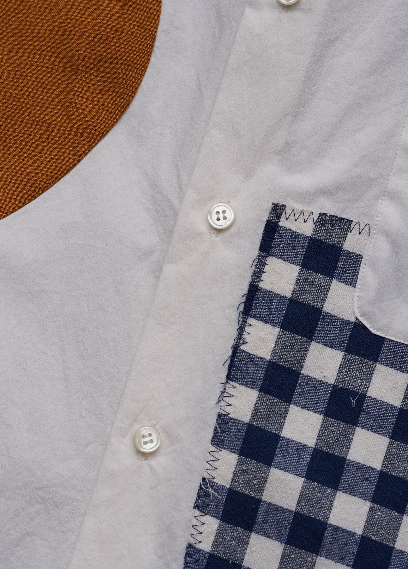 インパクト抜群の○△□のモチーフは、それぞれ異なる生地のパッチワークで表現しました。トロポポーズが得意とするパッチワークですが、今回はよく見ると中縫い・切りっぱなし・千鳥ミシンと縫い方も遊び心たっぷり。コットン、リネン、シルクと、素材の違いも楽しいデザインです。