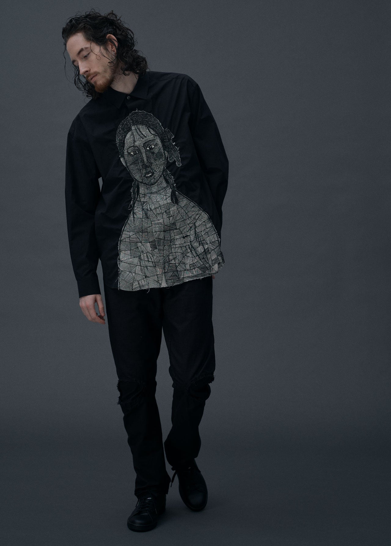 プロダクトとしての強度を感じられる、唯一無二の刺繍シャツ。モディリアーニ「おさげ髪の少女」をモチーフにしています。機械刺繍には出せない、手刺繍ならではの立体感と質感が魅力1点ものです。